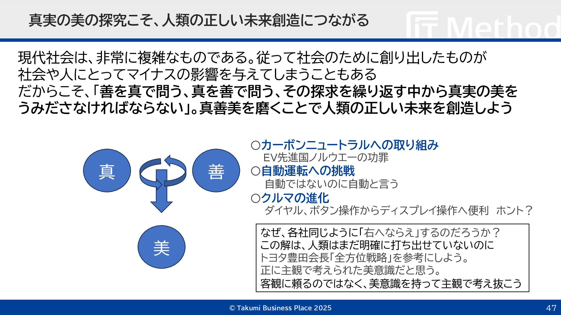 現代社会は、非常に複雑なものである。従って社会のために創り出したものが 社会や人にとってマイナスの影響を与えてしまうこともある だからこそ、「善を真で問う、真を善で問う、その探求を繰り返す中から真実の美を うみださなければならない」。真善美を磨くことで人類の正しい未来を創造しよう 〇カーボンニュートラルへの取り組み EV先進国ノルウエーの功罪 〇自動運転への挑戦 自動ではないのに自動と言う 〇クルマの進化 ダイヤル、ボタン操作からディスプレイ操作へ便利 ホント? なぜ、各社同じように「右へならえ」するのだろうか? この解は、人類はまだ明確に打ち出せていないのに トヨタ豊田会長「全方位戦略」を参考にしよう。 正に主観で考えられた美意識だと思う。 客観に頼るのではなく、美意識を持って主観で考え抜こう