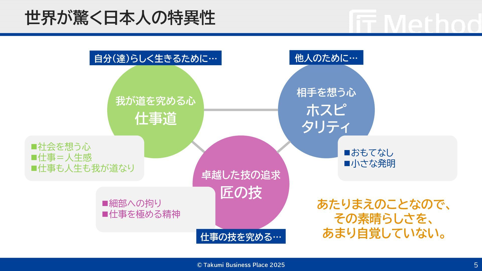 3. © Takumi Business Place 2025 世界が驚く日本人の特異性 5 あたりまえのことなので、 その素晴らしさを、 あまり自覚していない。