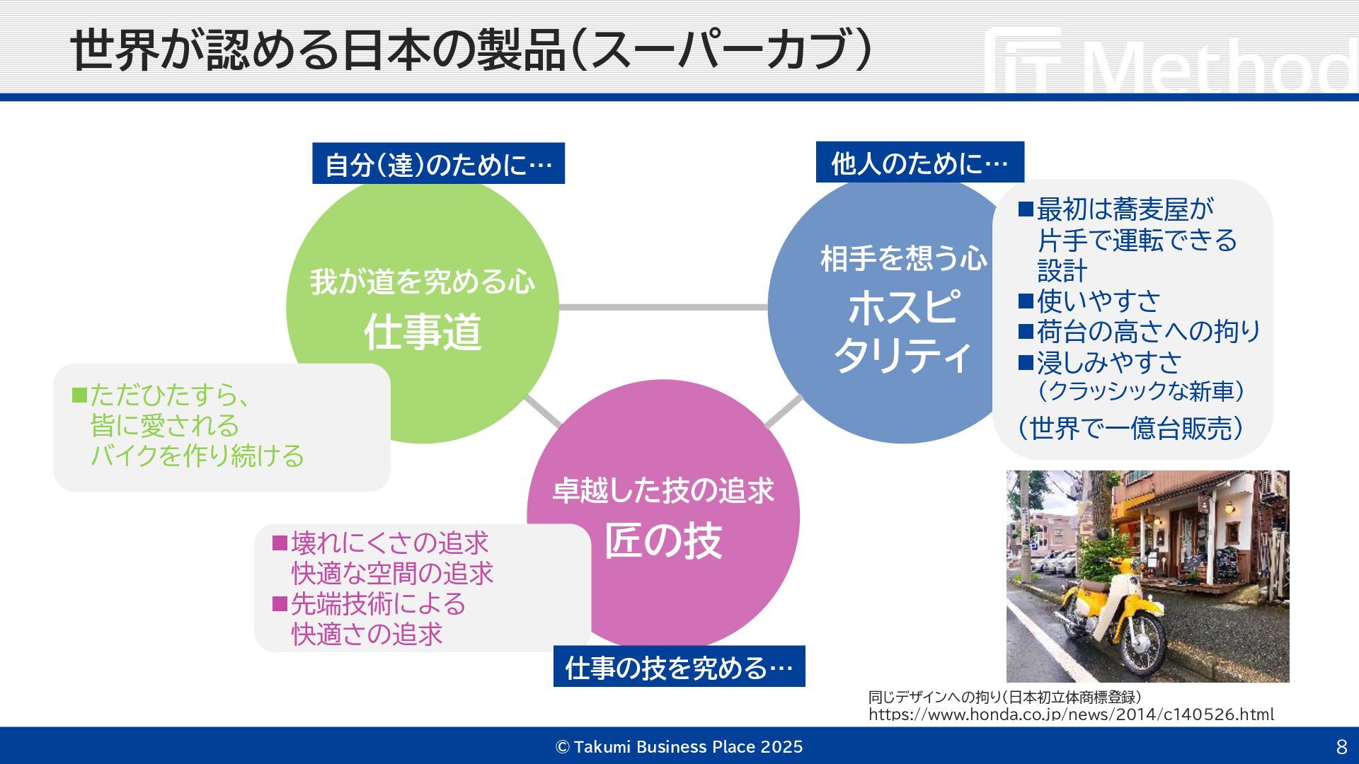 6. © Takumi Business Place 2025 世界が認める日本の製品(スーパーカブ) 8 同じデザインへの拘り(日本初立体商標登録) https://www.honda.co.jp/news/2014/c140526.html 相手を想う心
