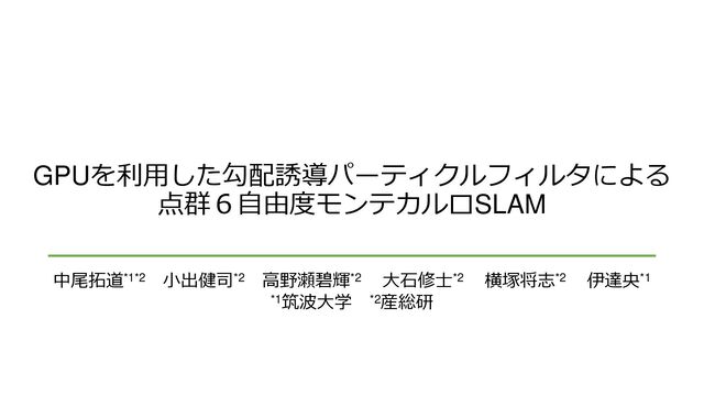𝐾 − 1 keyframe 𝑖 + 3 keyframe 𝑖 keyframe 𝒊 + 𝟏(o) ⋯ ⋯ 修正ステップ 勾配誘導パーティクル更新則(関連研究:Stein Particle Filter[Maken+, 2022] ,MegaParticles[Koide+, 2024] ) 尤度の勾配情報を用いてパーティクルを尤度の高い状態へ誘導 現在姿勢の更新ベクトル: ガウスニュートン法による尤度関数の二次勾配情報 キーフレーム姿勢の更新ベクトル: k番目のキーフレームまでの経路長 現在フレームまでの経路長 ※大量のパーティクルを並列処理するため,厳密な大域軌跡最適化は難しい • 更新則(斥力の項がないためループクローズ時に限り更新) 従来手法:正しいループ地点にパーティクルが必要 提案手法:正しいループ地点にパーティクルがいなくても正しい軌跡を推定可能