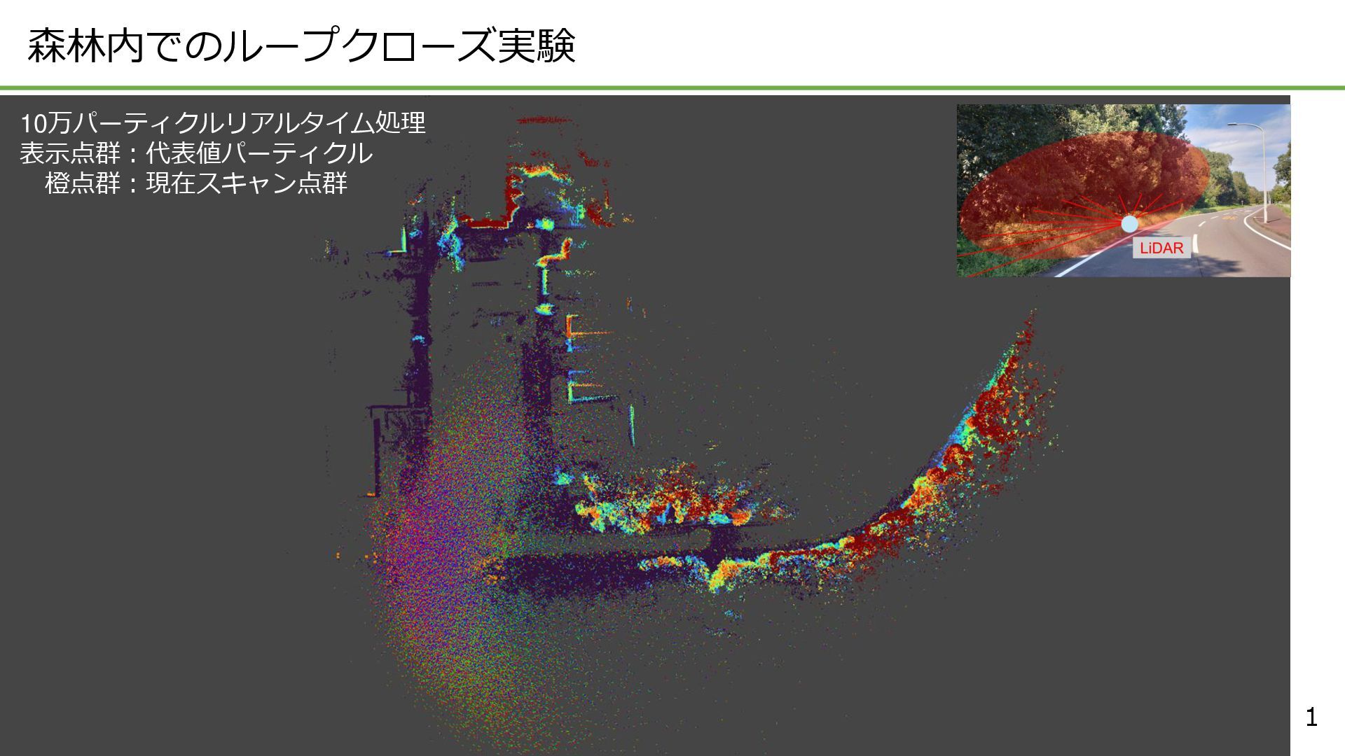勾配誘導パーティクル更新則によりサンプリング効率を向上 • GPUによる並列計算に適したアルゴリズムにより計算速度を向上  グラフベースSLAMに対する以下の優位性を示した • 曖昧性の強い森林内を模した環境において既存手法よりも高い精度で推定 • エレベータでの移動(1自由度の誘拐状態)を経ても正しい階でループクローズに成功 誘拐状態にも対処できる能力を示した