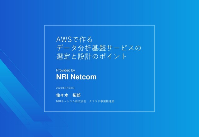 2021年3月18日 NRIネットコム株式会社 クラウド事業推進部 佐々木 拓郎 AWSで作る データ分析基盤サービスの 選定と設計のポイント Provided by