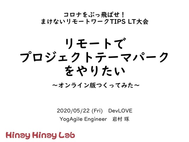 コロナをぶっ飛ばせ! まけないリモートワークTIPS LT大会 2020/05/22 (Fri) DevLOVE YogAgile Engineer 岩村 琢