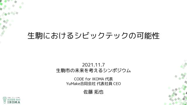 生駒におけるシビックテックの可能性 2021.11.7 生駒市の未来を考えるシンポジウム CODE for IKOMA 代表 YuMake合同会社 代表社員 CEO