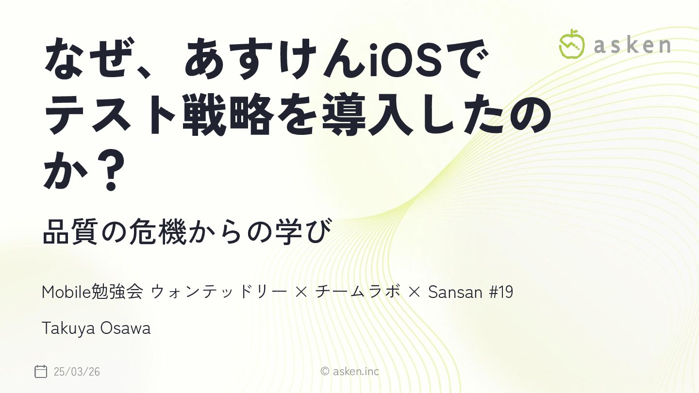 © asken.inc なぜ、あすけんiOSで テスト戦略を導入したの か? 品質の危機からの学び 25/03/26 Mobile勉強会 ウォンテッドリー ×