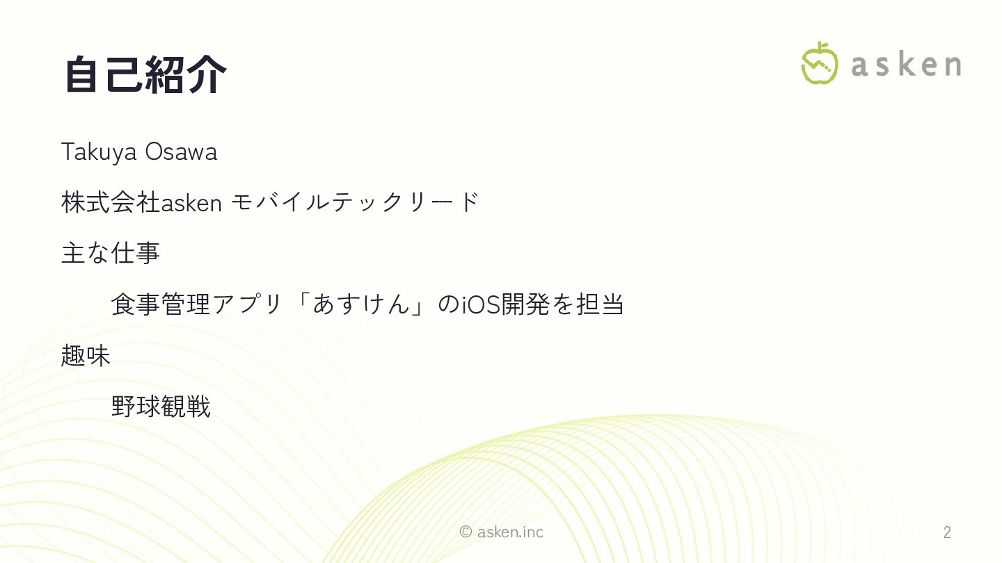 © asken.inc 2 自己紹介 Takuya Osawa 株式会社asken モバイルテックリード 主な仕事 食事管理アプリ「あすけん」のiOS開発を担当