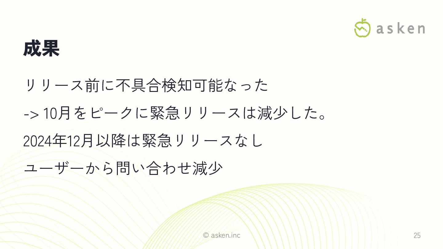 © asken.inc 25 成果 リリース前に不具合検知可能なった -> 10月をピークに緊急リリースは減少した。 2024年12月以降は緊急リリースなし ユーザーから問い合わせ減少