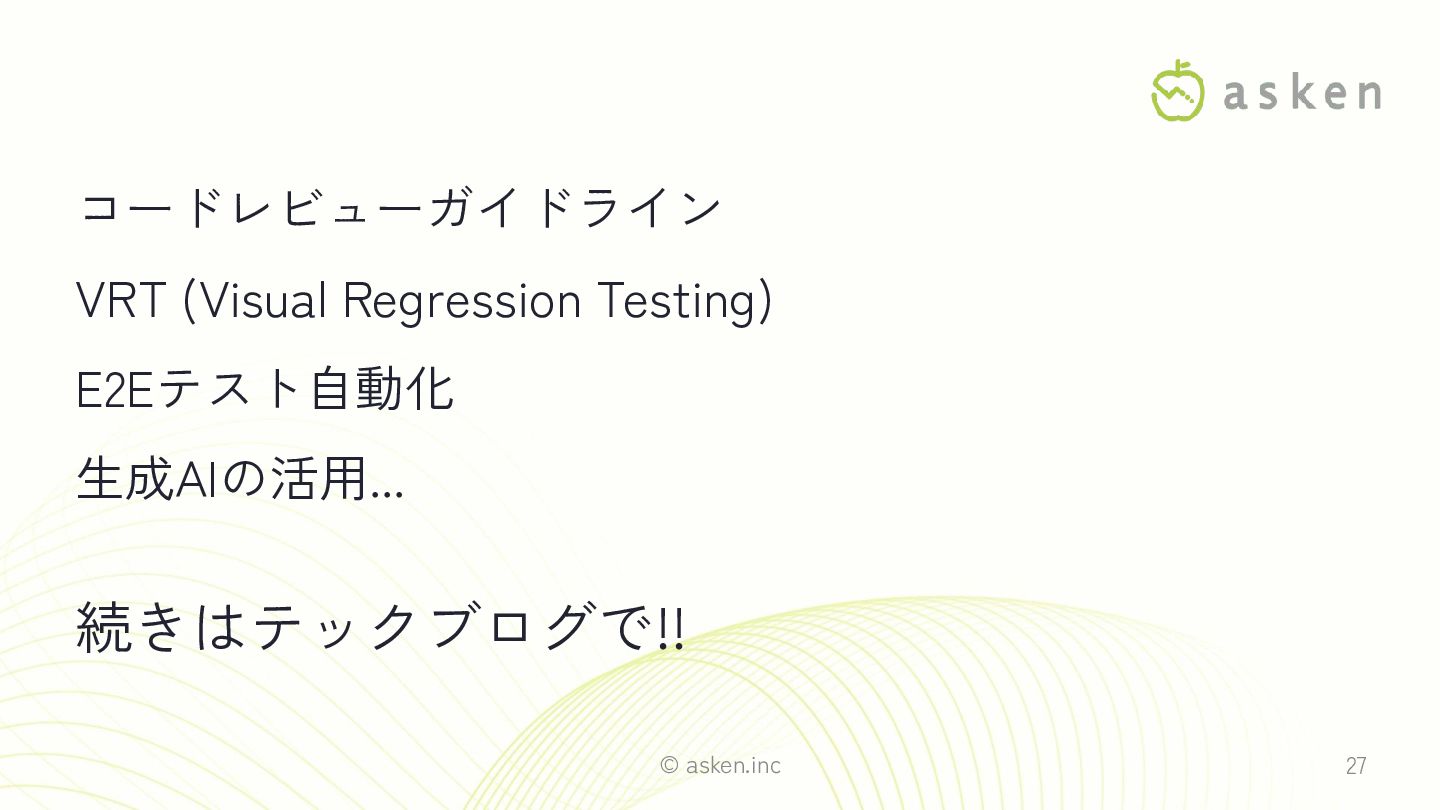 © asken.inc 27 コードレビューガイドライン VRT (Visual Regression Testing) E2Eテスト自動化 生成AIの活用...