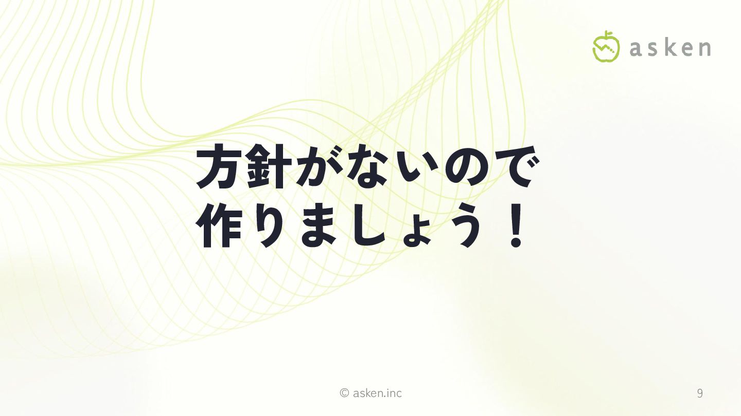 © asken.inc 8 何が問題だったのか? 品質をチームごととして捉えていなかった • 個人任せ ◦ ユニットテストの範囲や書き方も不明確 コード変更時に既存機能が壊れても気づけない
