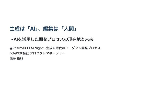 生成は「AI」 、編集は「人間」 〜AIを活用した開発プロセスの現在地と未来 @PharmaX LLM Night〜生成AI時代のプロダクト開発プロセス note株式会社 プロダクトマネージャー 浅子 拓耶