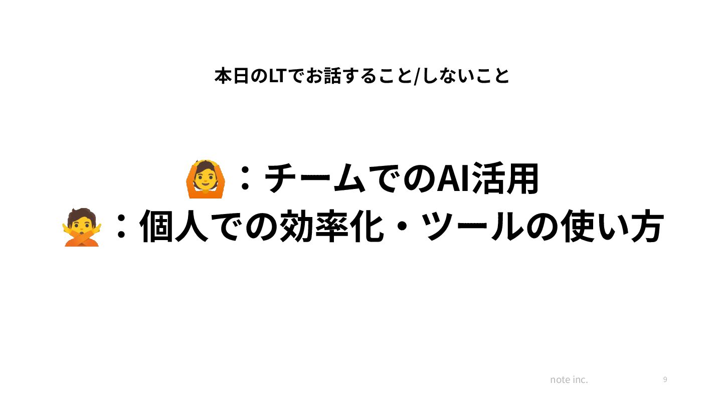 によって 判断基準がブレる AIの 出 ⼒ を 鵜呑みにしてしまう 1 2 3 レビュー項⽬を⾔語化し、AIで 事 前 レビューすることで、 ‧ 企 画 の 質 UP ‧レビュー 時 間 の 削 減 ‧同じことを何度も⾔う/⾔われ るストレスの低減 思想や企画検討時のチェックリ ストを共通化することで、 ‧ 企 画 、 意 思 決 定 の 質 UP ‧ 他 チームの 情 報 をつぶさに 把握する時間的コスト削減 ‧形骸化するチェックリストの 撲滅、⼿間削減 ガードレールとなる共 通コンテキス トが存在することで、 ‧⽣成結果を鵜呑みにしたがゆえの ⼿戻り削減 ‧ 社 歴 や 知 識 の 有 無 を 問 わず、 (⼀定)安⼼して企画を任せられる ‧ 結 果 としてアウトカムが 早 く、 ⼤きく出せる確率が上がる(?)