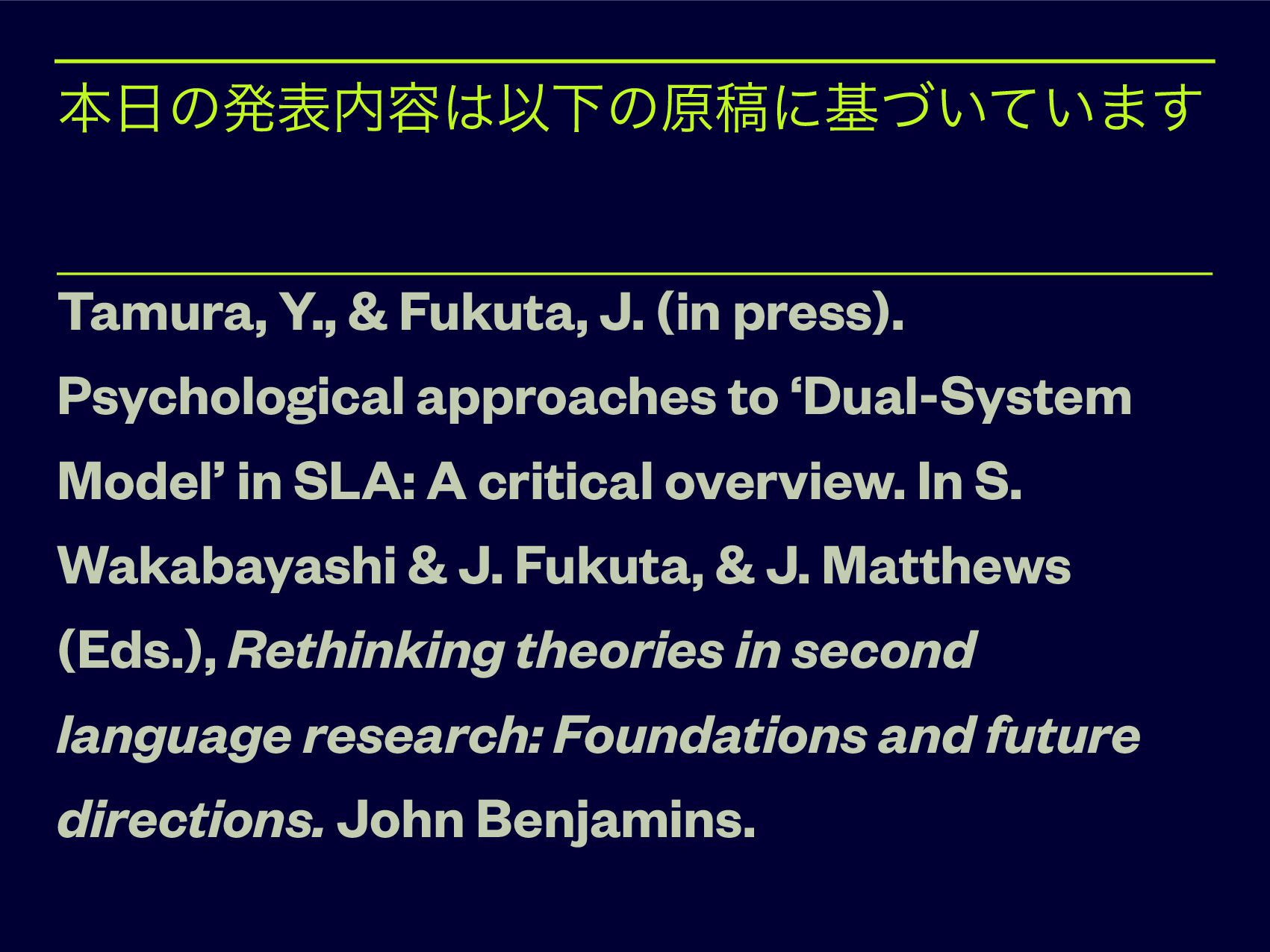 ‘Dual-System Model’ in SLA: A critical overview. In S. Wakabayashi & J. Fukuta, & J. Matthews (Eds.), Rethinking theories in second language research: Foundations and future directions. John Benjamins. ຊͷൃද༰ҎԼͷݪߘʹج͍͍ͮͯ·͢