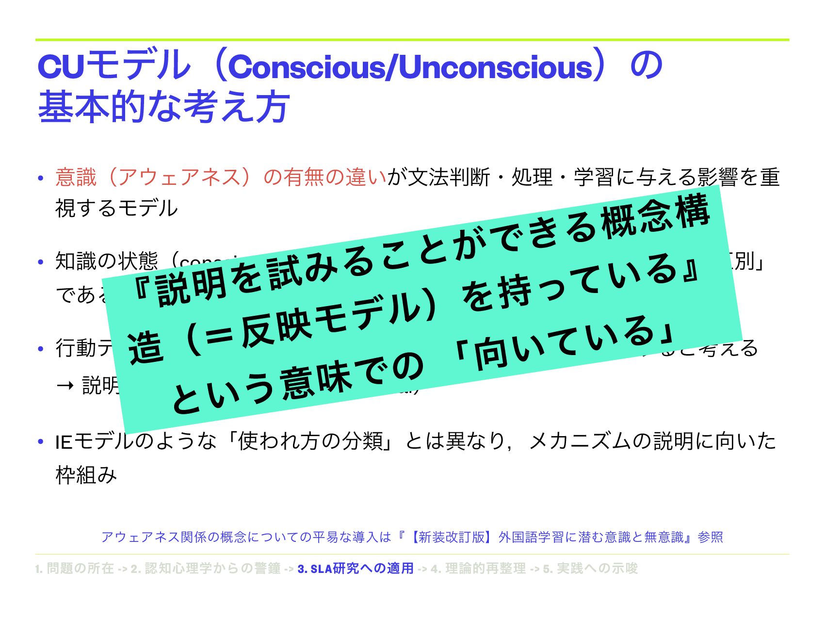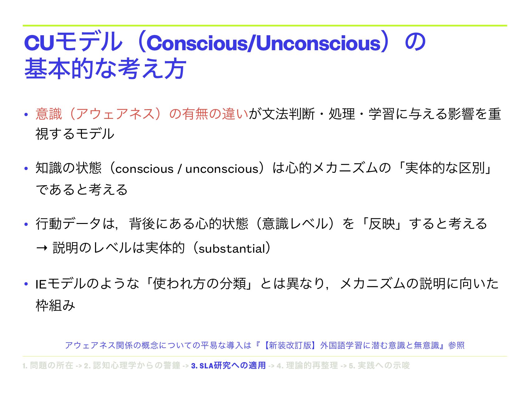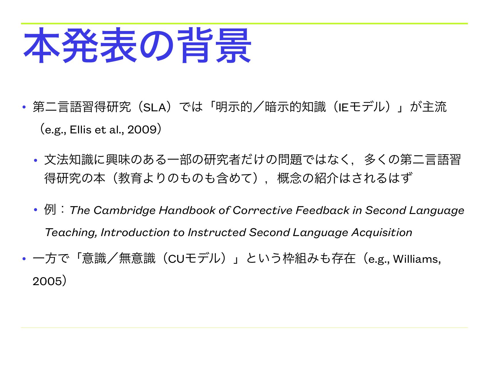 • ྫɿThe Cambridge Handbook of Corrective Feedback in Second Language Teaching, Introduction to Instructed Second Language Acquisition • ҰํͰʮҙࣝʗແҙࣝʢCUϞσϧʣʯͱ͍͏Έଘࡏʢe.g., Williams, 2005ʣ ຊൃදͷഎܠ