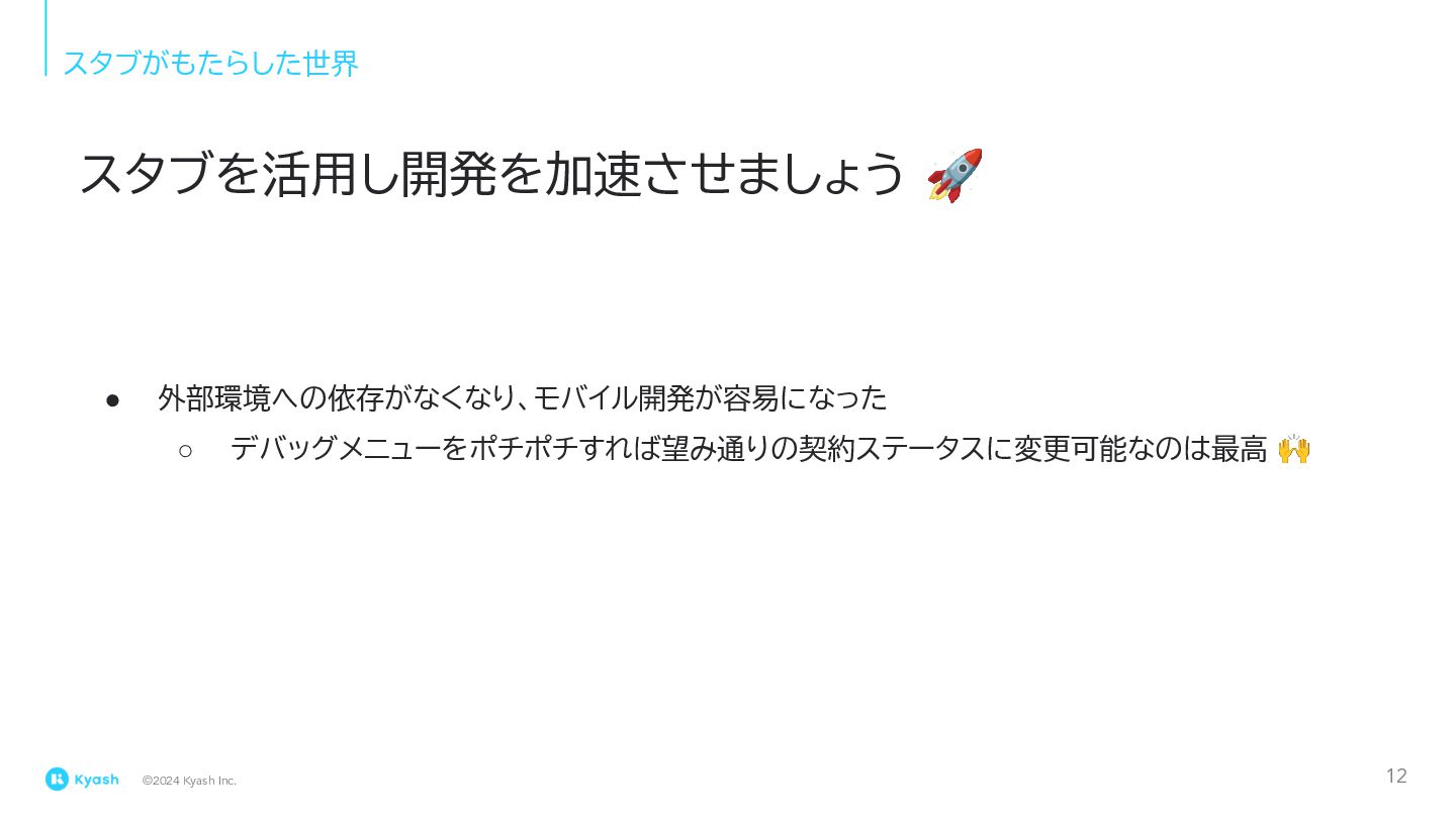 ©2024 Kyash Inc. スタブがもたらした世界 スタブを活用し開発を加速させましょう 🚀 12 • 外部環境への依存がなくなり、モバイル開発が容易になった ◦