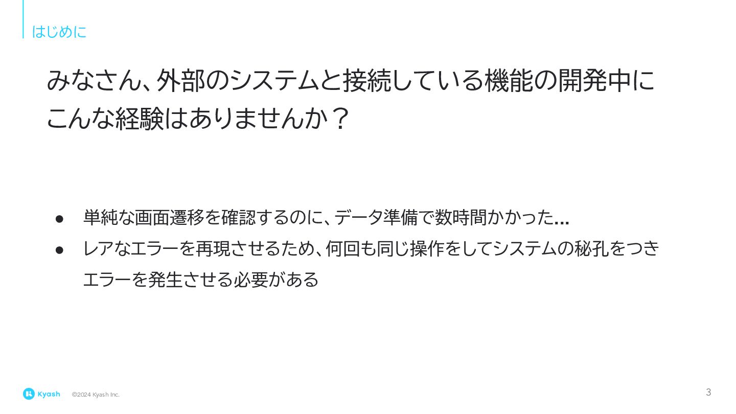 ©2024 Kyash Inc. はじめに • 単純な画面遷移を確認するのに、データ準備で数時間かかった... • レアなエラーを再現させるため、何回も同じ操作をしてシステムの秘孔をつき エラーを発生させる必要がある みなさん、外部のシステムと接続している機能の開発中に