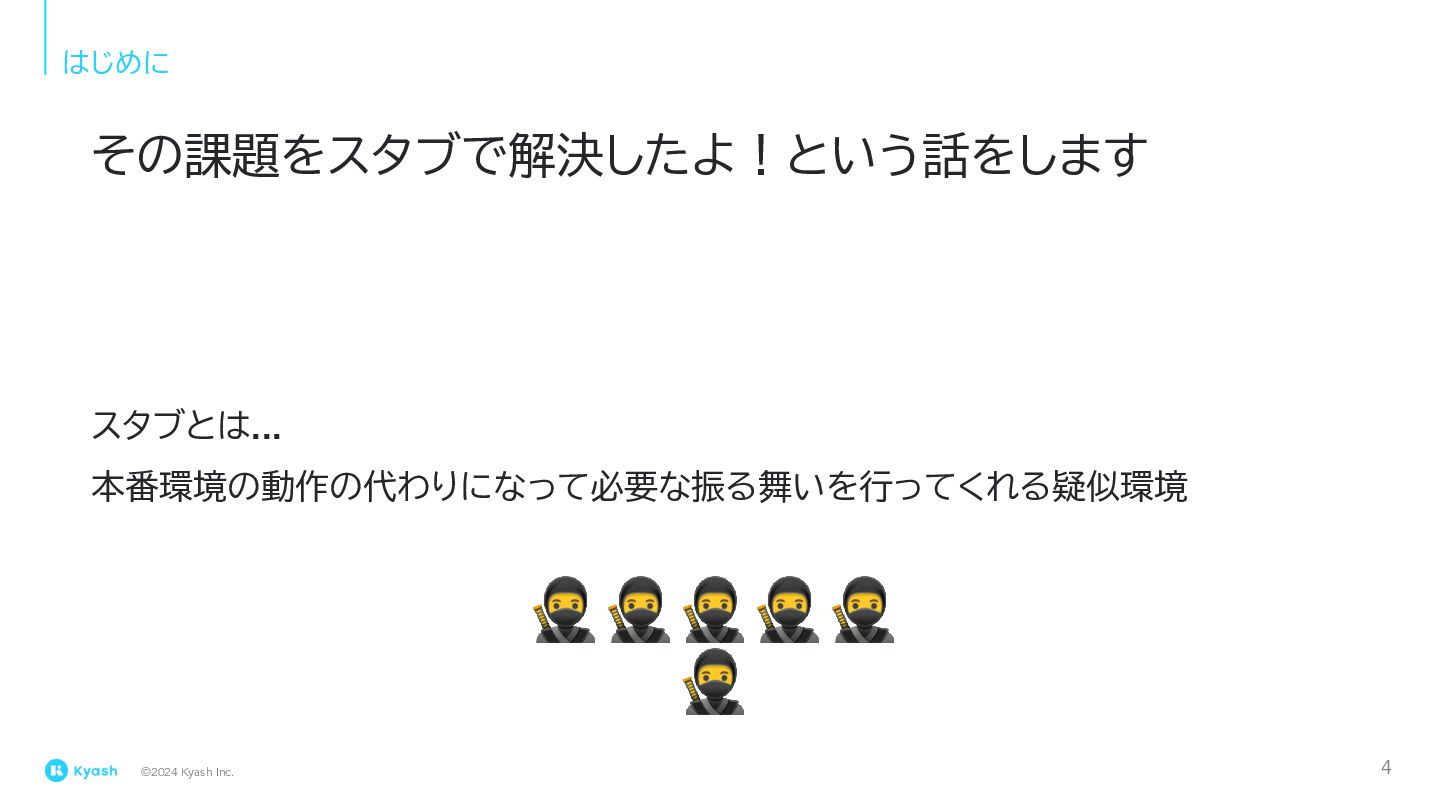 ©2024 Kyash Inc. はじめに その課題をスタブで解決したよ!という話をします 4 スタブとは... 本番環境の動作の代わりになって必要な振る舞いを行ってくれる疑似環境 🥷🥷🥷🥷🥷 🥷