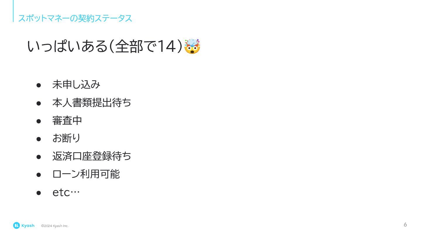 ©2024 Kyash Inc. スポットマネーの契約ステータス いっぱいある(全部で14)🤯 6 • 未申し込み • 本人書類提出待ち