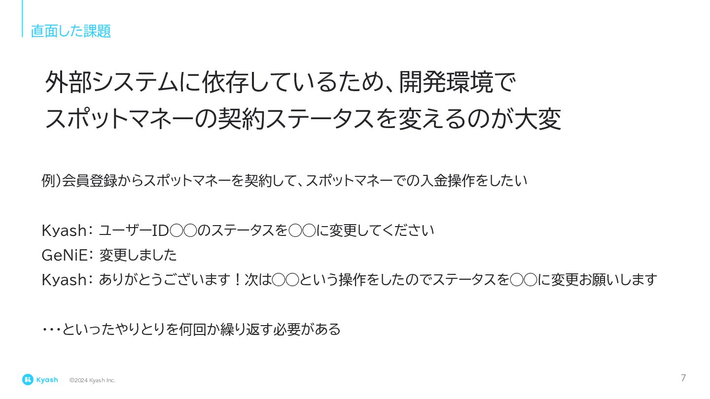 ありがとうございます!次は◯◯という操作をしたのでステータスを◯◯に変更お願いします ・・・といったやりとりを何回か繰り返す必要がある 外部システムに依存しているため、開発環境で スポットマネーの契約ステータスを変えるのが大変 7