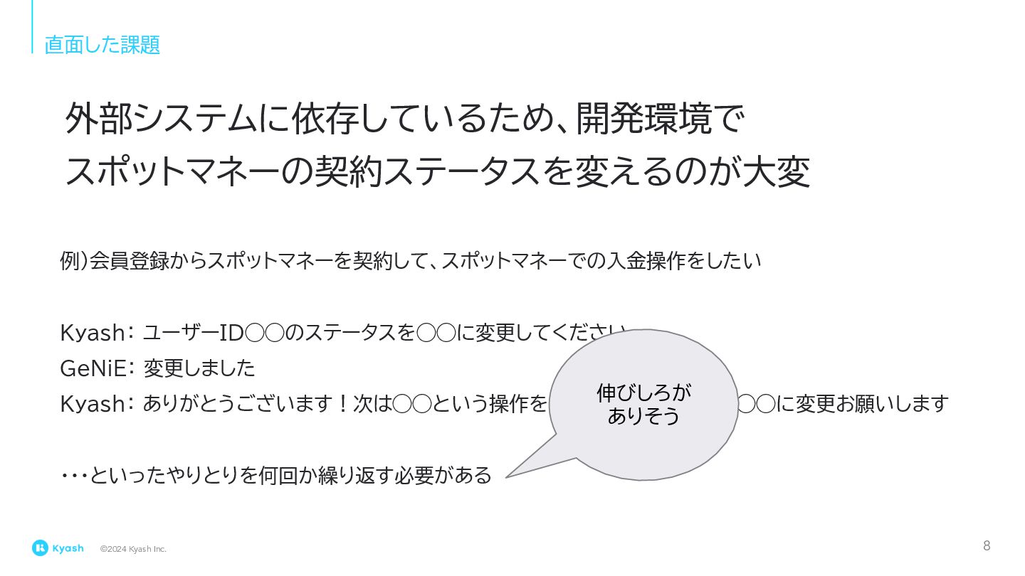 ありがとうございます!次は◯◯という操作をしたのでステータスを◯◯に変更お願いします ・・・といったやりとりを何回か繰り返す必要がある 外部システムに依存しているため、開発環境で スポットマネーの契約ステータスを変えるのが大変 8 伸びしろが ありそう