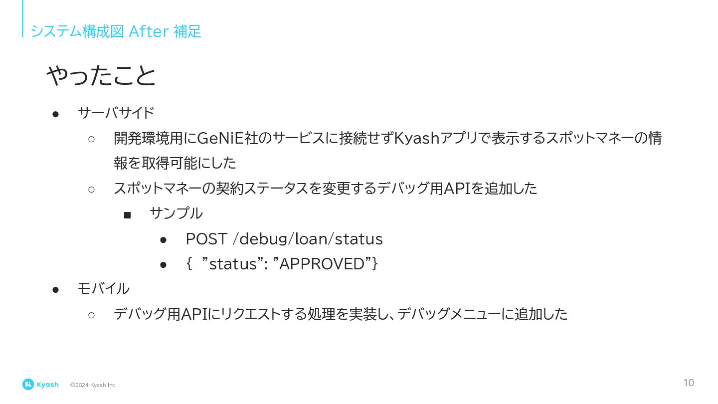 ©2024 Kyash Inc. システム構成図 After 補足 • サーバサイド ◦ 開発環境用にGeNiE社のサービスに接続せずKyashアプリで表示するスポットマネーの情