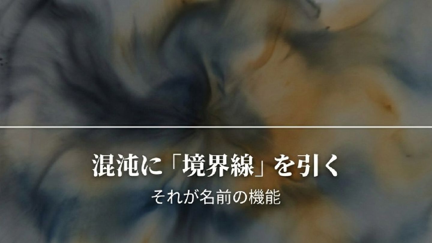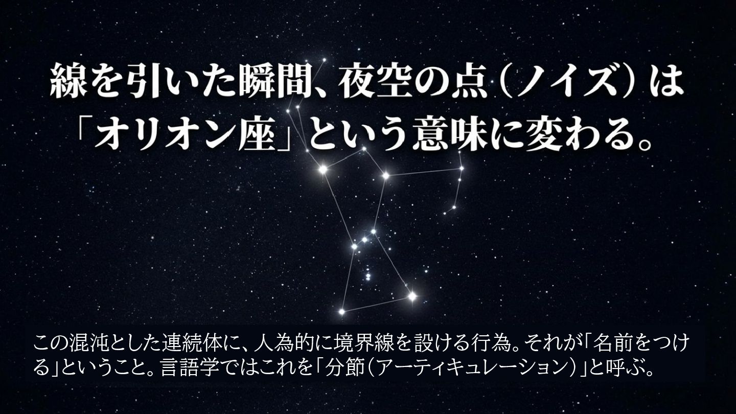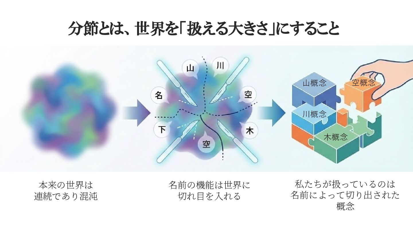 物理的な世界は、本来なめらかな連続体。そこに「名前」という境界線を引くことで初めて、私たちは混沌から「意味」を切り出し、思考可能な場所として世界を捉えることができます。