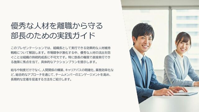 このプレゼンテーションでは、組織長として実行できる効果的な人材維持戦略について解説します。市場競争が激化する中、優秀な人材の流出を防ぐことは組織の持続的成長に不可欠です。特に部長の権限で直接実行できる施策に焦点を当て、具体的なアクションプランを提示します。