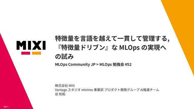 19:10 ~ 19:35 特徴量を言語を越えて一貫して管理する, 『特徴量ドリブン』な MLOps の実現への試み 谷 知拓 (Taniii) 様