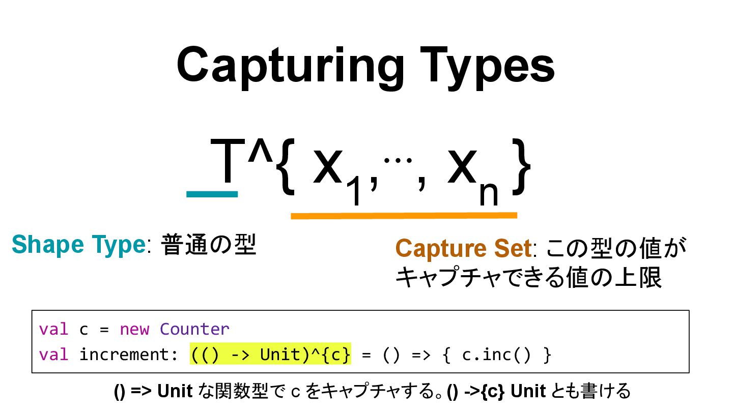 Set: この型の値が キャプチャできる値の上限 Shape Type: 普通の型 val c = new Counter val increment: (() -> Unit)^{c} = () => { c.inc() } () => Unit な関数型で c をキャプチャする。() ->{c} Unit とも書ける