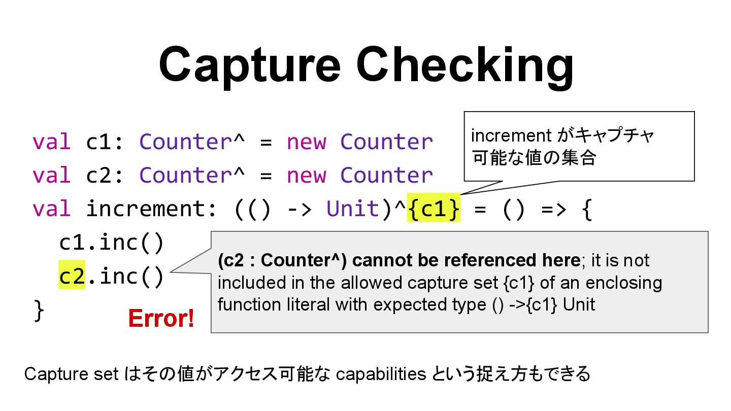 Counter^ = new Counter val increment: (() -> Unit)^{c1} = () => { c1.inc() c2.inc() } (c2 : Counter^) cannot be referenced here; it is not included in the allowed capture set {c1} of an enclosing function literal with expected type () ->{c1} Unit Error! increment がキャプチャ 可能な値の集合 Capture set はその値がアクセス可能な capabilities という捉え方もできる
