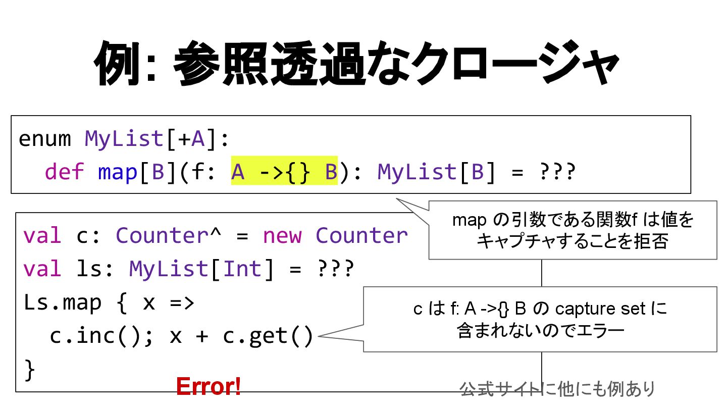 ??? Ls.map { x => c.inc(); x + c.get() } 例: 参照透過なクロージャ enum MyList[+A]: def map[B](f: A ->{} B): MyList[B] = ??? map の引数である関数f は値を キャプチャすることを拒否 Error! c は f: A ->{} B の capture set に 含まれないのでエラー 公式サイトに他にも例あり