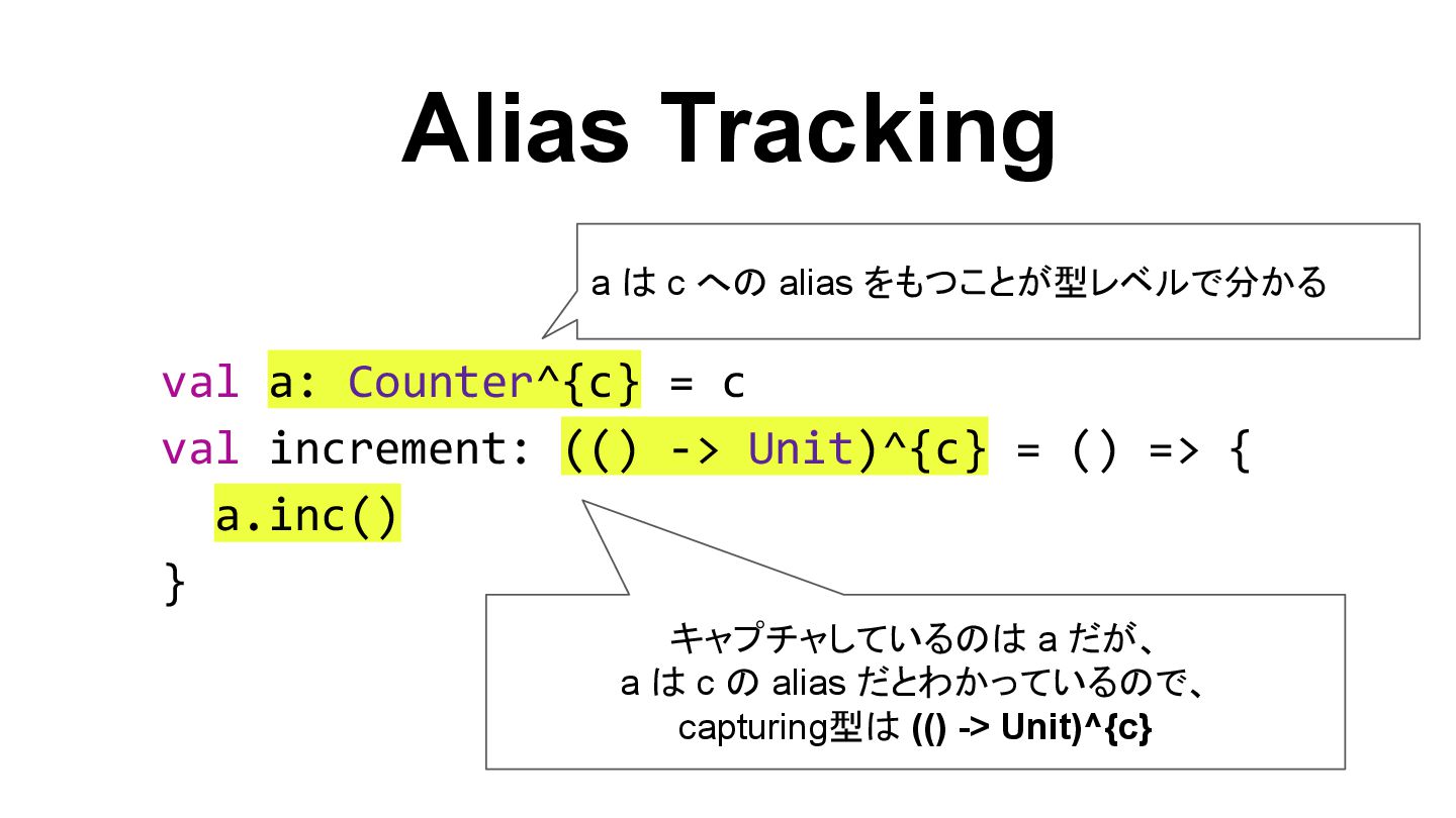 -> Unit)^{c} = () => { a.inc() } a は c への alias をもつことが型レベルで分かる キャプチャしているのは a だが、 a は c の alias だとわかっているので、 capturing型は (() -> Unit)^{c}