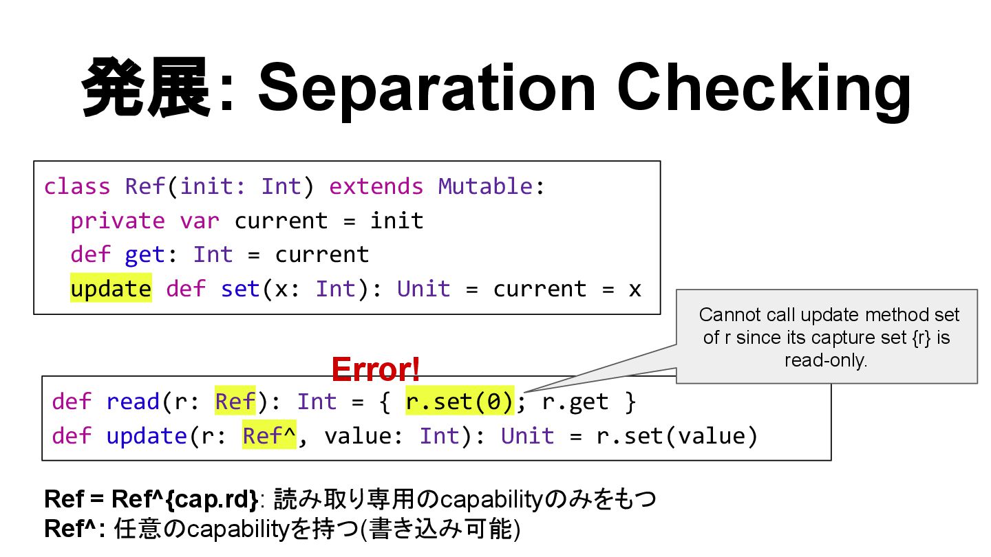 current = init def get: Int = current update def set(x: Int): Unit = current = x def read(r: Ref): Int = { r.set(0); r.get } def update(r: Ref^, value: Int): Unit = r.set(value) Cannot call update method set of r since its capture set {r} is read-only. Error! Ref = Ref^{cap.rd}: 読み取り専用のcapabilityのみをもつ Ref^: 任意のcapabilityを持つ(書き込み可能)