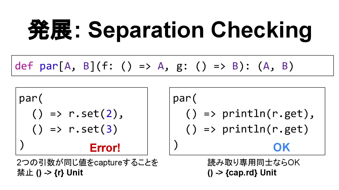 () => B): (A, B) par( () => r.set(2), () => r.set(3) ) Error! 2つの引数が同じ値をcaptureすることを 禁止 () -> {r} Unit par( () => println(r.get), () => println(r.get) ) OK 読み取り専用同士ならOK () -> {cap.rd} Unit