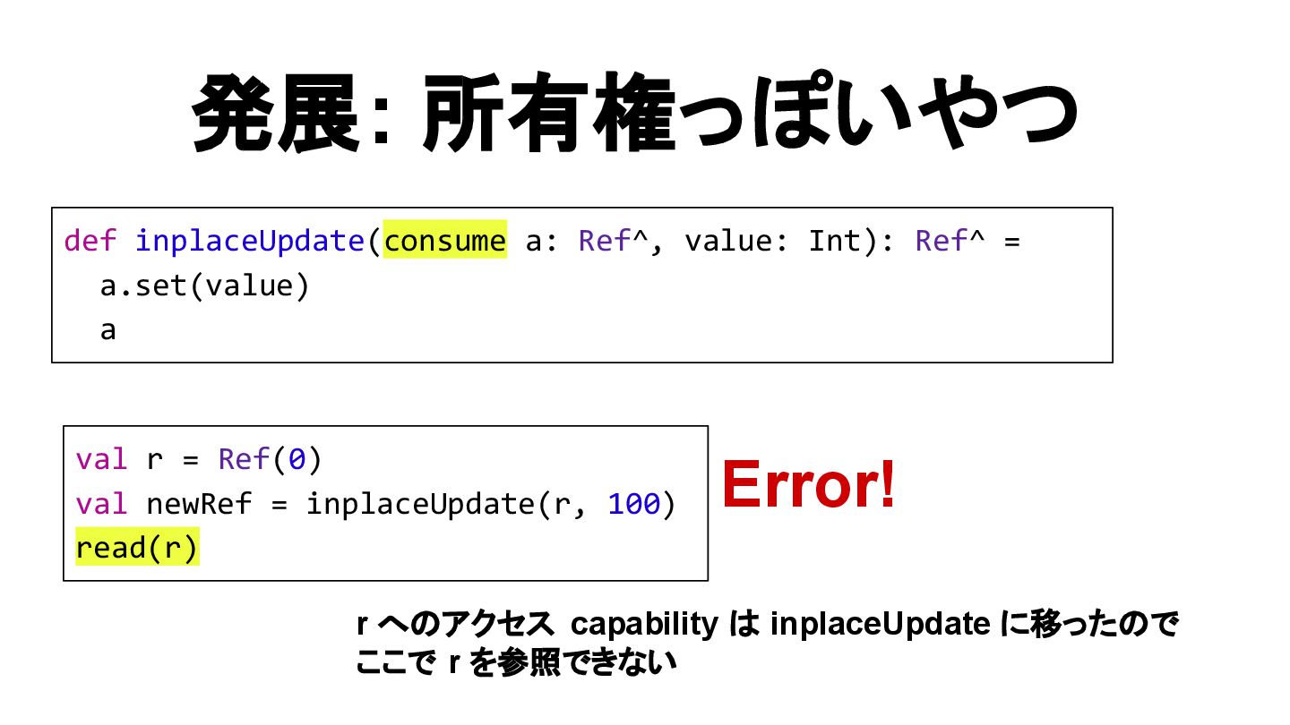 a.set(value) a val r = Ref(0) val newRef = inplaceUpdate(r, 100) read(r) Error! r へのアクセス capability は inplaceUpdate に移ったので ここで r を参照できない