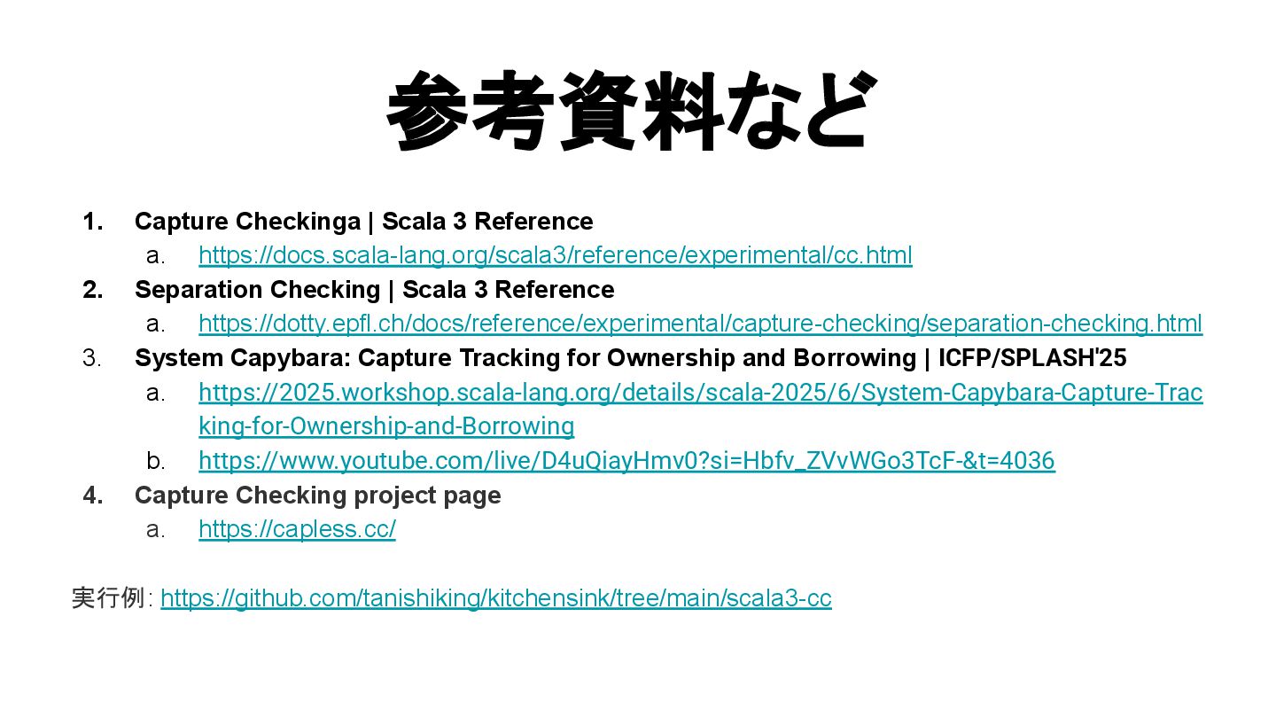 2. Separation Checking | Scala 3 Reference a. https://dotty.epfl.ch/docs/reference/experimental/capture-checking/separation-checking.html 3. System Capybara: Capture Tracking for Ownership and Borrowing | ICFP/SPLASH'25 a. https://2025.workshop.scala-lang.org/details/scala-2025/6/System-Capybara-Capture-Trac king-for-Ownership-and-Borrowing b. https://www.youtube.com/live/D4uQiayHmv0?si=Hbfv_ZVvWGo3TcF-&t=4036 4. Capture Checking project page a. https://capless.cc/ 実行例: https://github.com/tanishiking/kitchensink/tree/main/scala3-cc