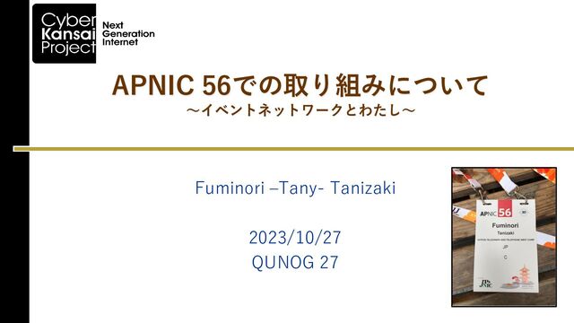 APNIC 56での取り組みについて 〜イベントネットワークとわたし〜 Fuminori –Tany- Tanizaki 2023/10/27 QUNOG 27