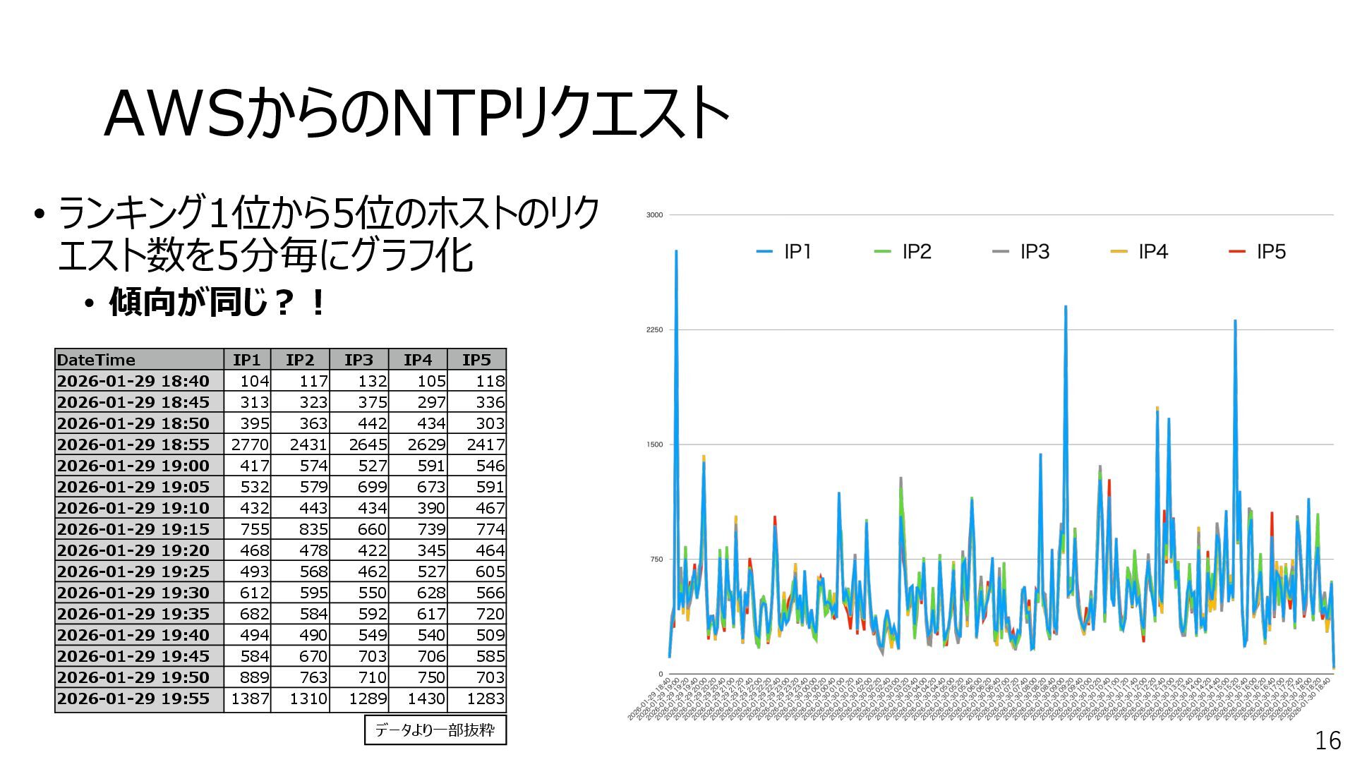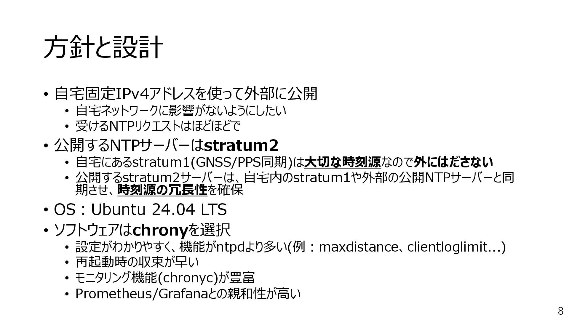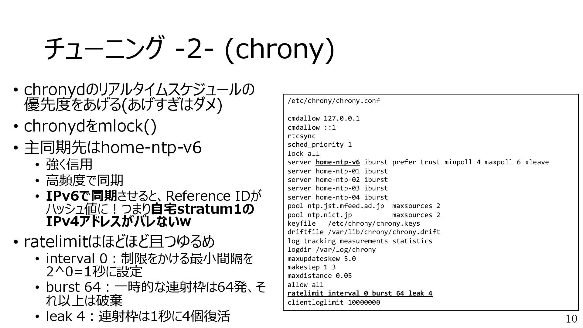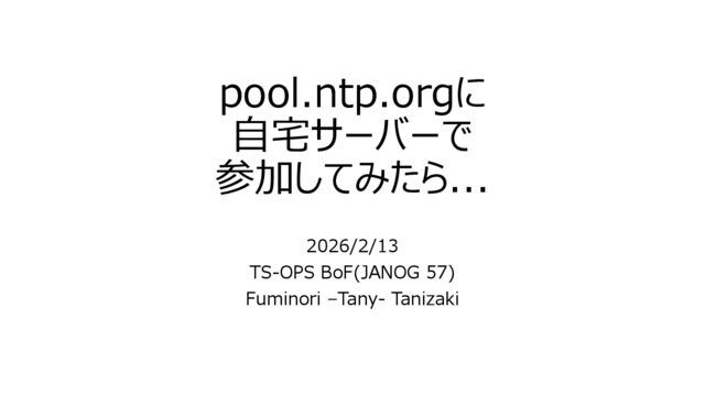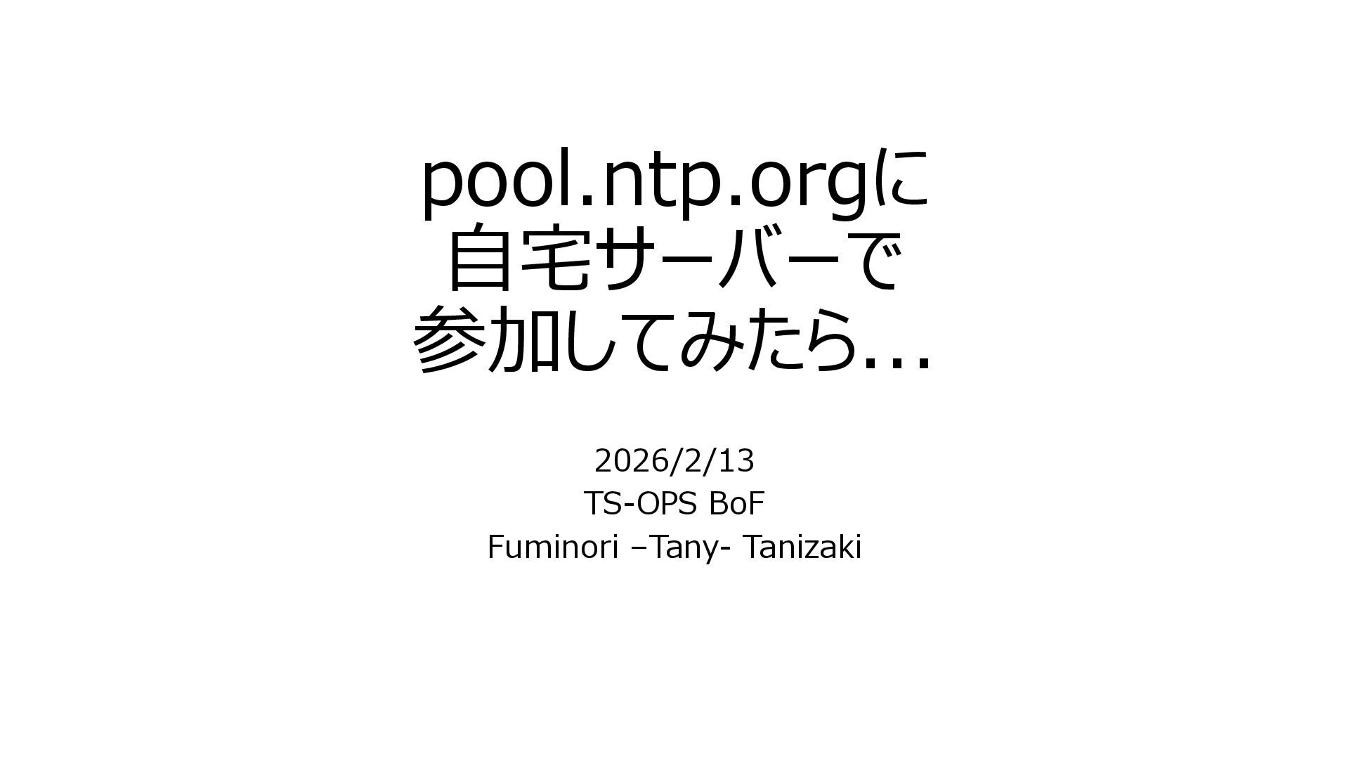 (2/13 15:50に最新版に差し替えました) 2025年12月末より自宅サーバーをstratum2としてpool.ntp.orgに参加させてみたところ、AWS東京リージョンから多くのアクセスがあることがわかった。本発表ではNTPサーバーの(泥臭い)チューニングについて、また、なぜAWS東京リージョンからのアクセスが多いのか?を仮説を交えて発表する