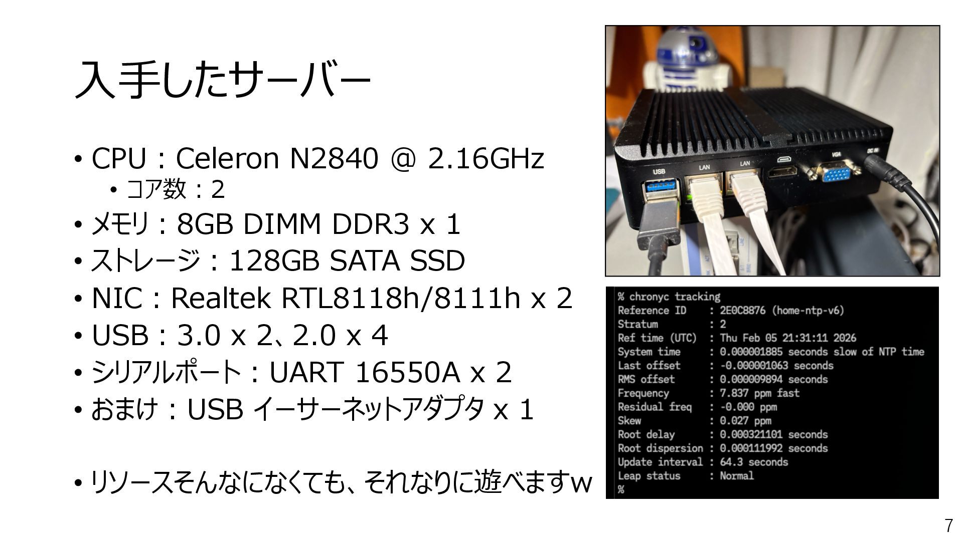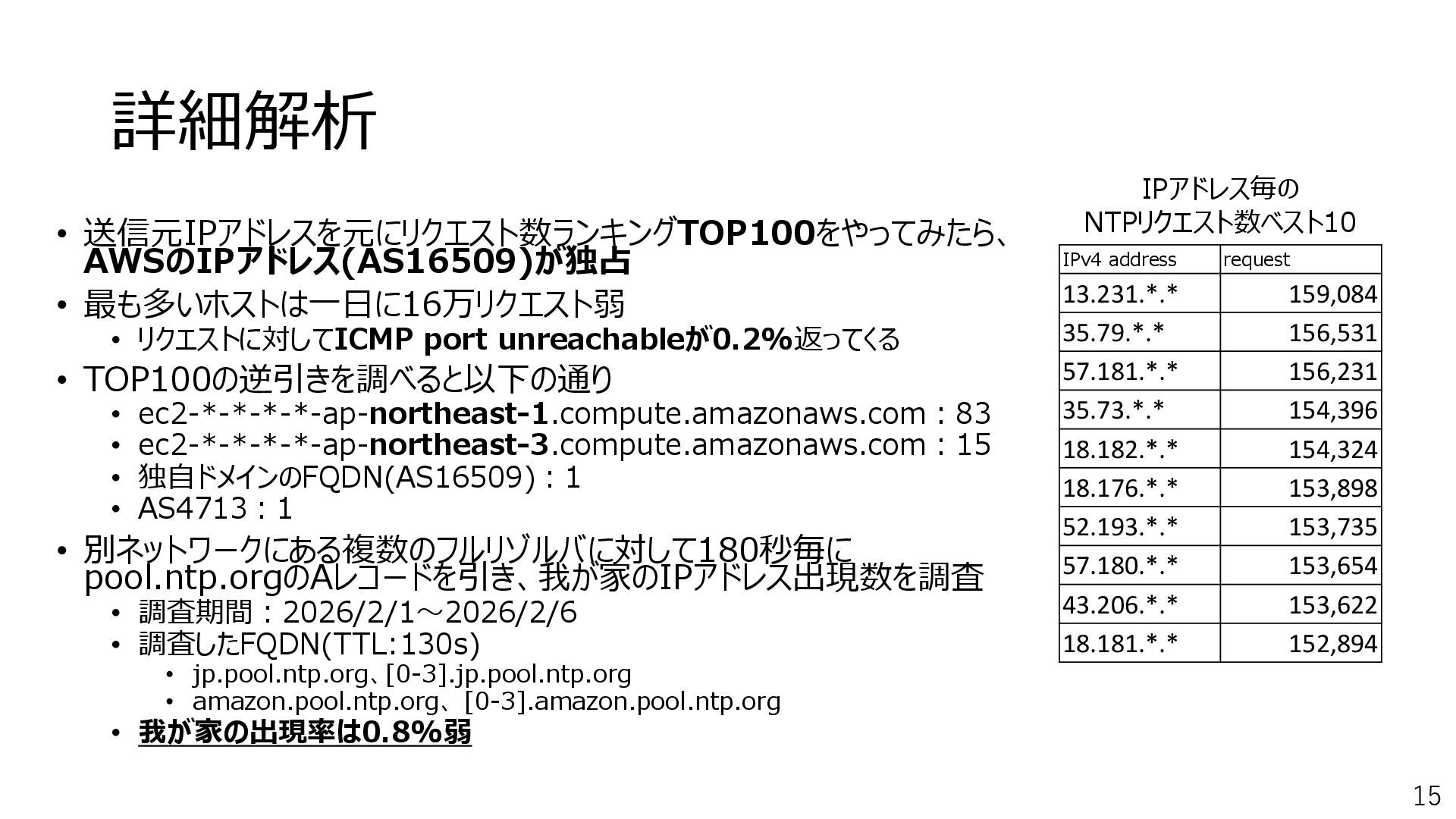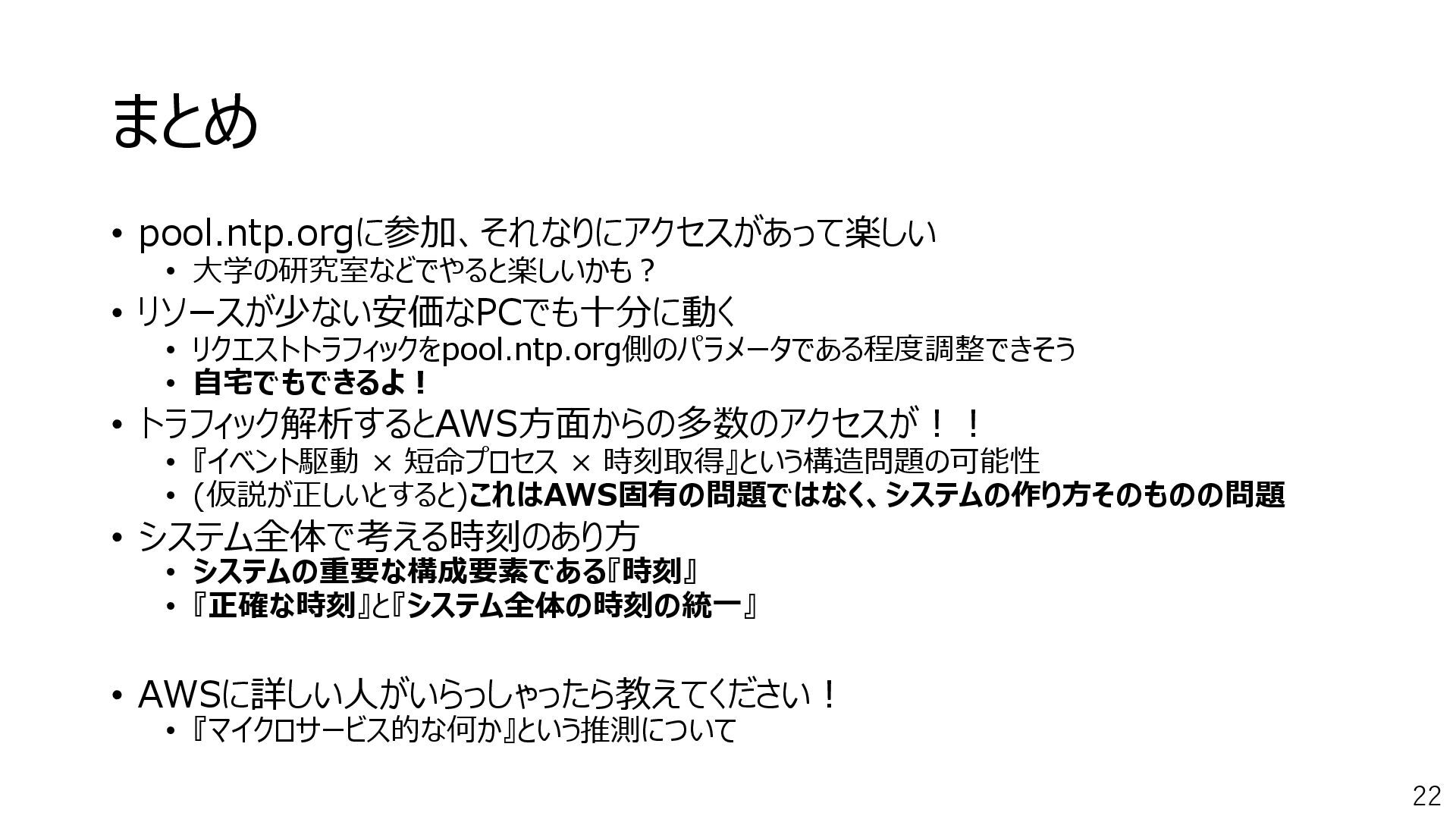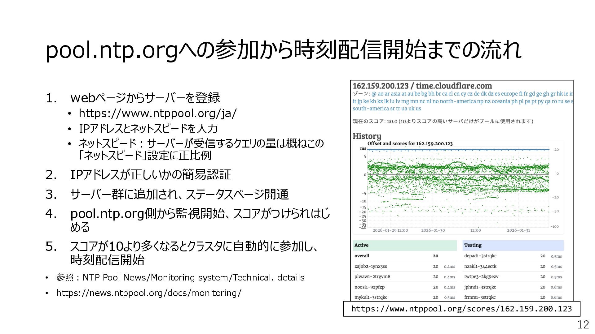 (2/13 15:50に最新版に差し替えました) 2025年12月末より自宅サーバーをstratum2としてpool.ntp.orgに参加させてみたところ、AWS東京リージョンから多くのアクセスがあることがわかった。本発表ではNTPサーバーの(泥臭い)チューニングについて、また、なぜAWS東京リージョンからのアクセスが多いのか?を仮説を交えて発表する