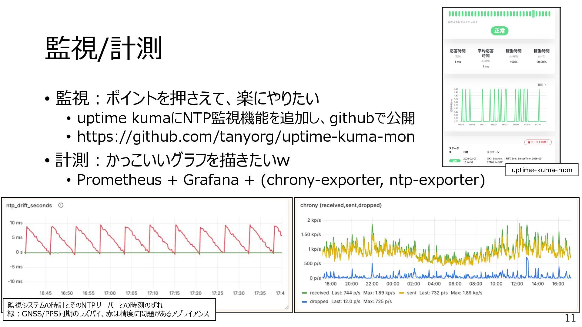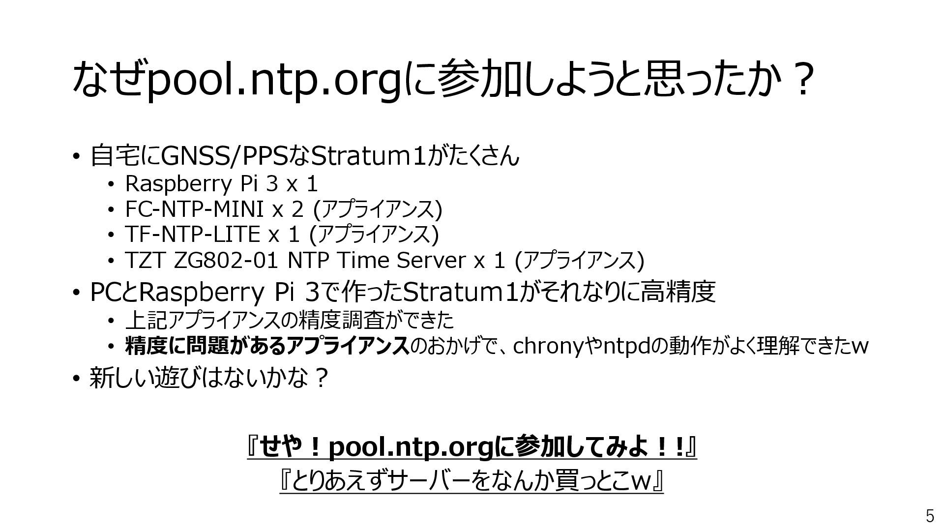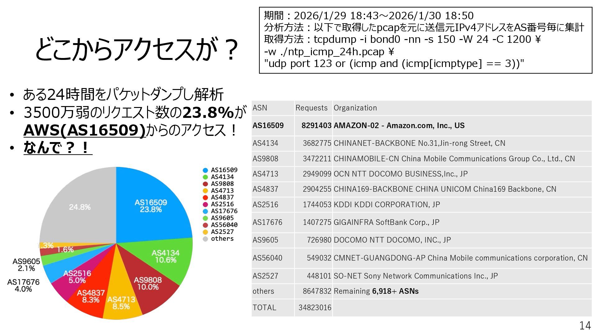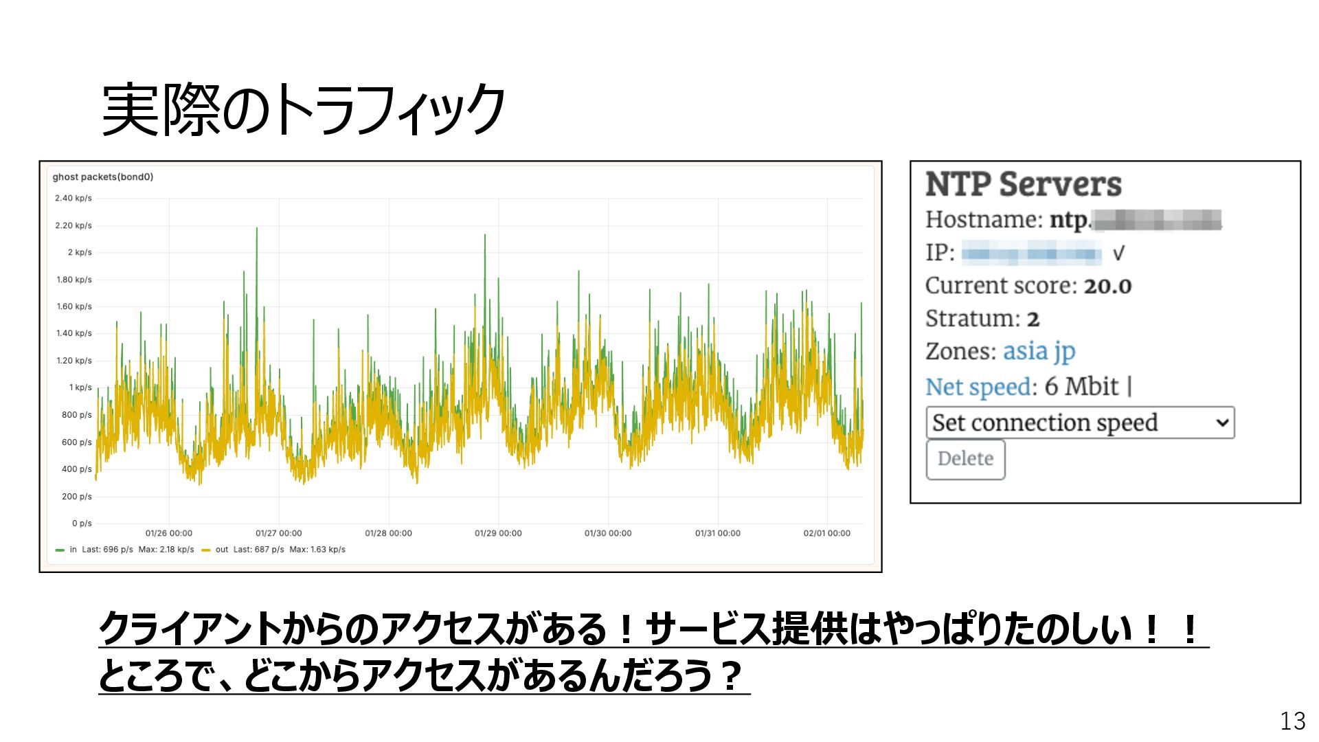 (2/13 15:50に最新版に差し替えました) 2025年12月末より自宅サーバーをstratum2としてpool.ntp.orgに参加させてみたところ、AWS東京リージョンから多くのアクセスがあることがわかった。本発表ではNTPサーバーの(泥臭い)チューニングについて、また、なぜAWS東京リージョンからのアクセスが多いのか?を仮説を交えて発表する