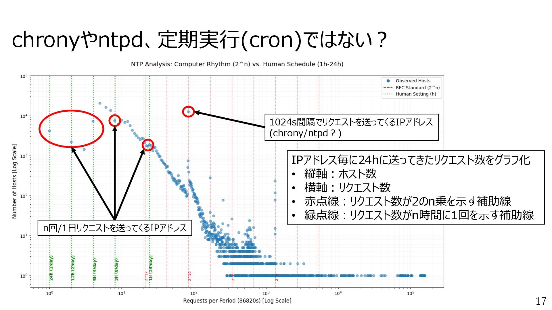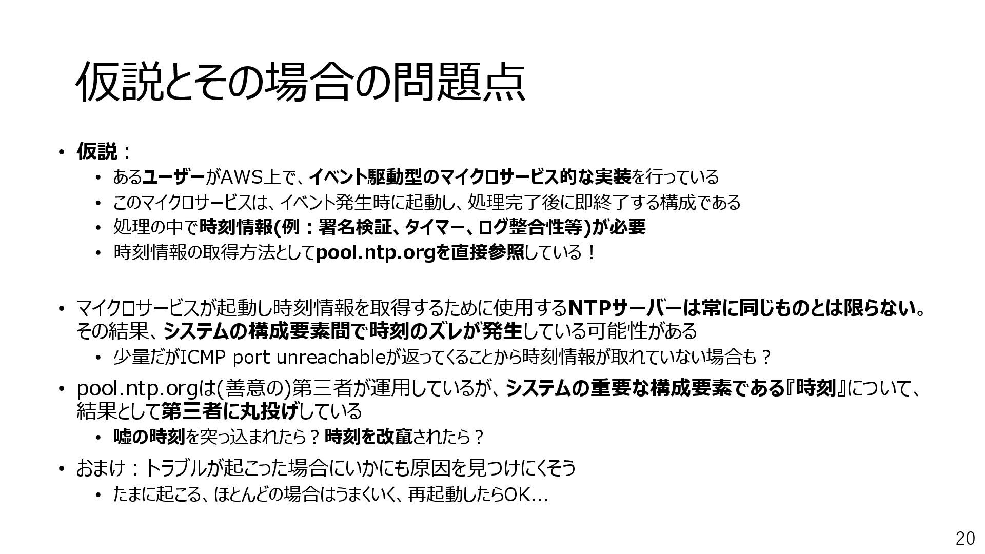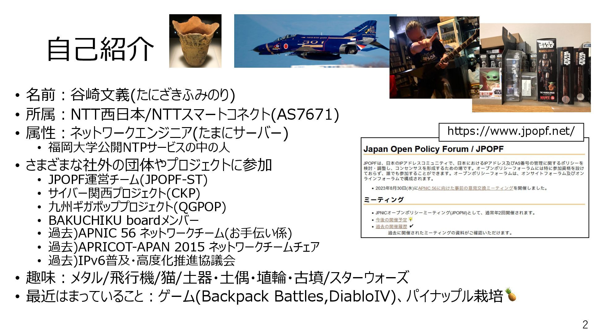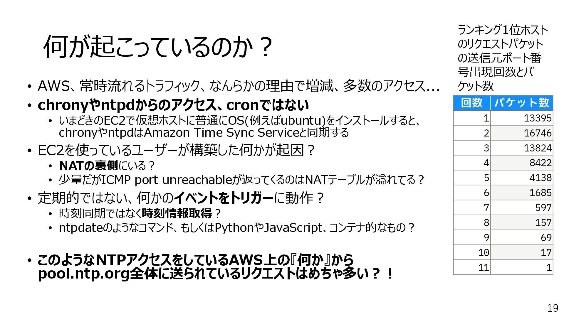 (2/13 15:50に最新版に差し替えました) 2025年12月末より自宅サーバーをstratum2としてpool.ntp.orgに参加させてみたところ、AWS東京リージョンから多くのアクセスがあることがわかった。本発表ではNTPサーバーの(泥臭い)チューニングについて、また、なぜAWS東京リージョンからのアクセスが多いのか?を仮説を交えて発表する