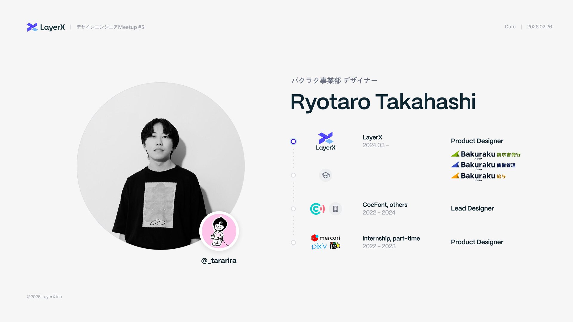 .0 2. 26 ©2026 La yer X .in c Я é ¯ ‰mè Ƕ ¤Êü Ryotaro Takahas hi Lay erX 20 24. 03 - Pr od uct D esi gn er Co eF ont , oth er s 20 22 - 2 02 4 Lead Design er In tern shi p, par t-ti me 20 22 - 2 02 3 Pr od uct D esi gn er @_ ta ra ri ra