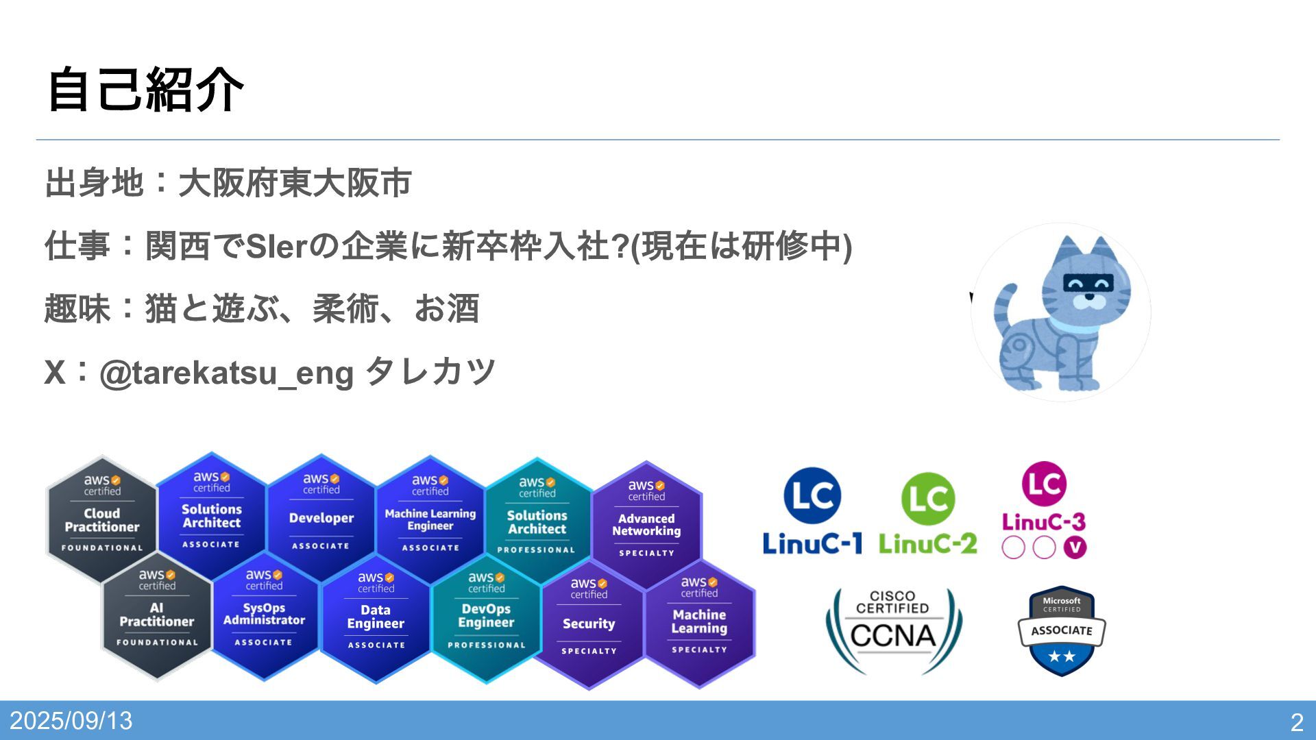 2025/09/13 ग़ɿେࡕ౦େࡕࢢ ࣄɿؔͰSIerͷاۀʹ৽ଔೖࣾ?(ݱࡏݚमத) झຯɿೣͱ༡Ϳɺॊज़ɺ͓ञ Xɿ@tarekatsu_eng λϨΧπ ࣗݾհ 2