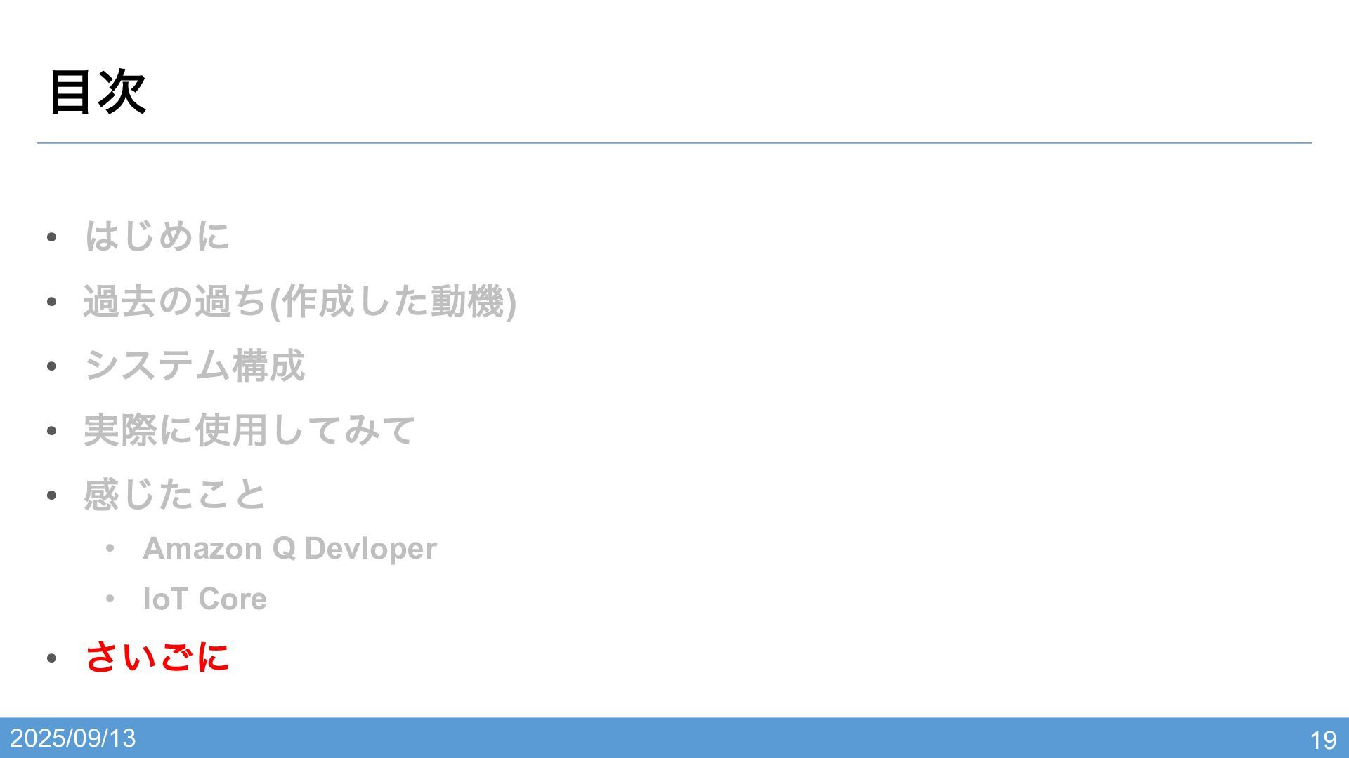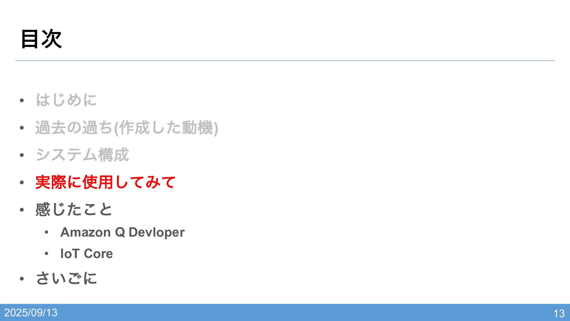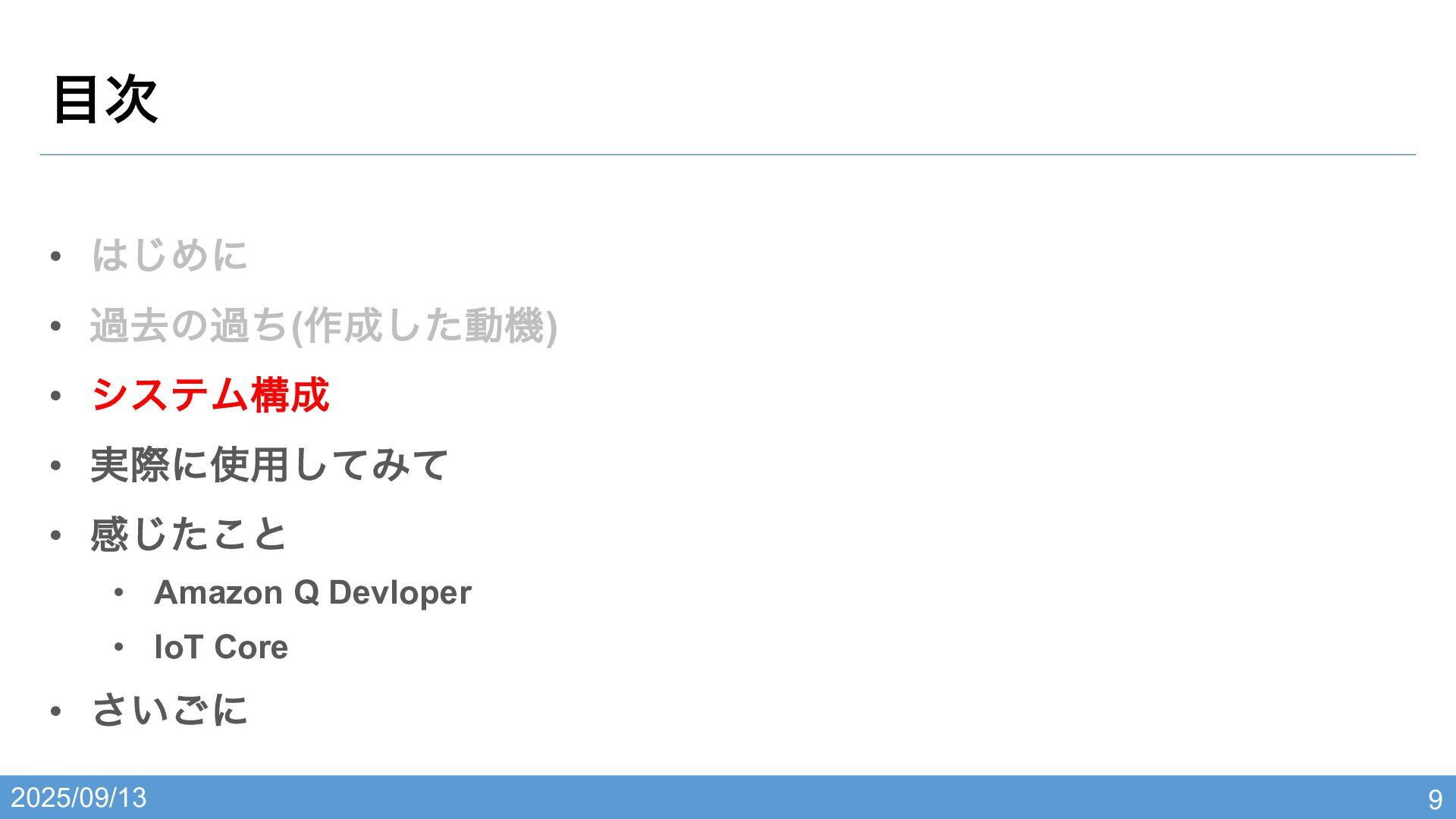 2025/09/13 ࠓͷ༰ • Q DeveloperΛ༻͍ͨόΠϒίʔσΟϯάͰײͨ͜͡ͱ • IoT CoreΛ৮ͬͯΈͯײͨ͜͡ͱ • Θͨ͠ͷল