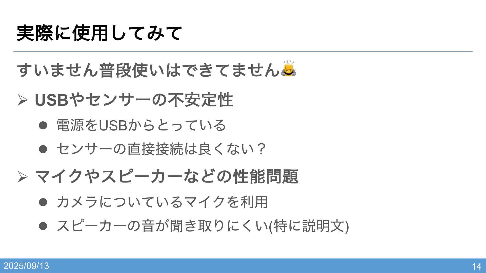2025/09/13 ࣮ࡍʹ༻ͯ͠Έͯ 14 ͍͢·ͤΜීஈ͍Ͱ͖ͯ·ͤΜ🙇 Ø USBηϯαʔͷෆ҆ఆੑ l ిݯΛUSB͔Βͱ͍ͬͯΔ l ηϯαʔͷଓྑ͘ͳ͍ʁ