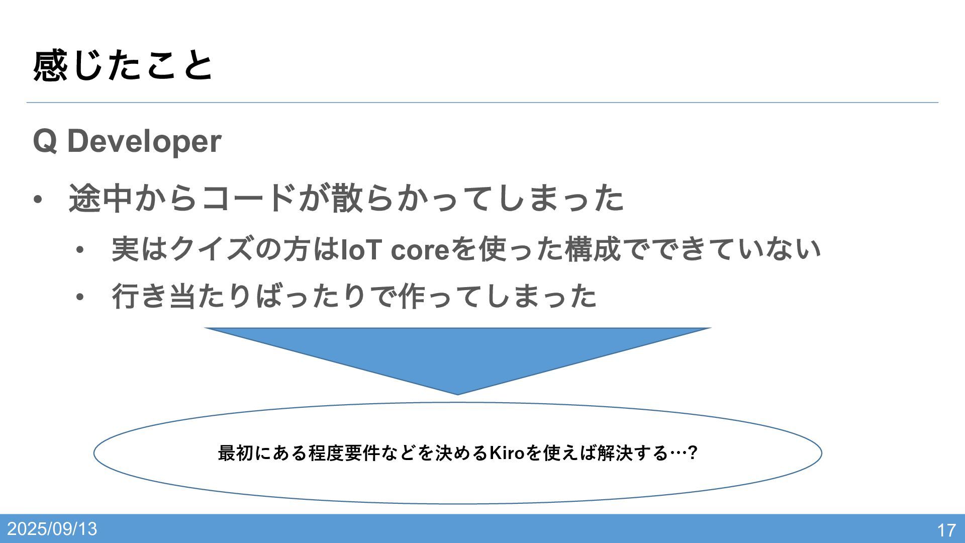 2025/09/13 Q Developer • ్த͔Βίʔυ͕ࢄΒ͔ͬͯ͠·ͬͨ • ࣮ΫΠζͷํIoT coreΛͬͨߏͰͰ͖͍ͯͳ͍ • ߦ͖ͨΓͬͨΓͰ࡞ͬͯ͠·ͬͨ