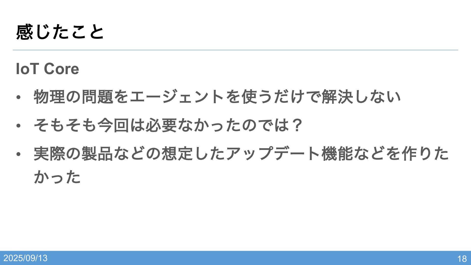 2025/09/13 IoT Core • ཧͷΛΤʔδΣϯτΛ͏͚ͩͰղܾ͠ͳ͍ • ͦͦࠓճඞཁͳ͔ͬͨͷͰʁ • ࣮ࡍͷͳͲͷఆͨ͠ΞοϓσʔτػೳͳͲΛ࡞Γͨ ͔ͬͨ