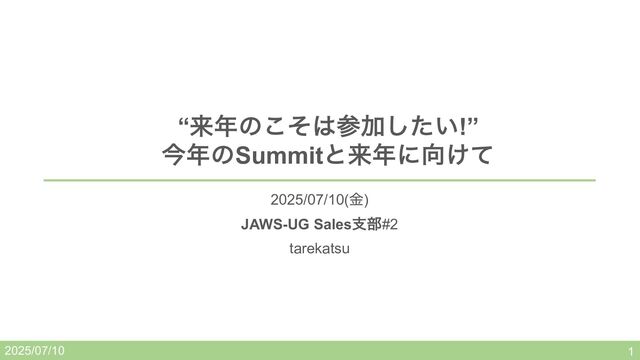 2025/07/10 “དྷͷͦ͜ࢀՃ͍ͨ͠!” ࠓͷSummitͱདྷʹ͚ͯ 2025/07/10(ۚ) JAWS-UG Salesࢧ෦#2 tarekatsu 1