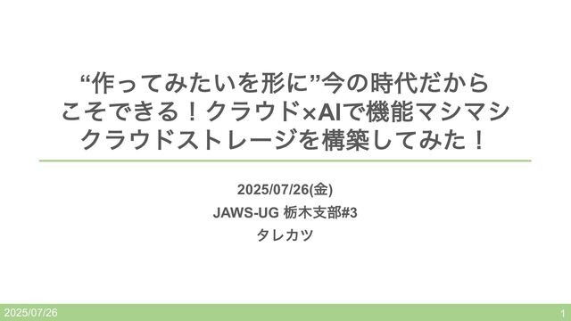 2025/07/26 “࡞ͬͯΈ͍ͨΛܗʹ”ࠓͷ͔࣌ͩΒ ͦ͜Ͱ͖ΔʂΫϥυºAIͰػೳϚγϚγ ΫϥυετϨʔδΛߏஙͯ͠Έͨʂ 2025/07/26(ۚ) JAWS-UG ಢࢧ෦#3 λϨΧπ 1