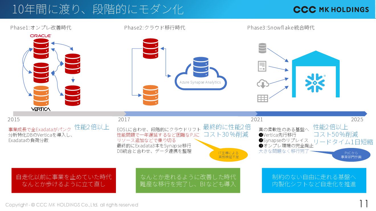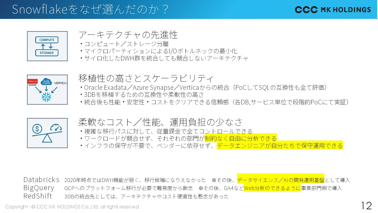 11 Azure Synapse Analytics 2015 2017 2021 2025 Phase1:オンプレ改善時代 Phase2:クラウド移行時代 Phase3:Snowflake統合時代 事業成長で全Exadataがパンク 分析特化DBのVerticaを導入し、 Exadataの負荷分散 性能2倍以上 EOSLに合わせ、段階的にクラウドリフト 性能問題で一年遅延するなど困難なPJに リソース追加などで乗り切る 最終的にExadata3本をSynapse移行 DB統合と合わせ、データ連携を整理 最終的に性能2倍 コスト30%削減 真の柔軟性のある基盤へ ❶Vertica先行移行 ❷Synapseのリプレイス ❸オンプレ環境の完全廃止 大きな問題なく移行完了 性能2倍以上 コスト50%削減 リードタイム1日短縮 10年間に渡り、段階的にモダン化 IT主導による 実務検証不足 PoCから 事業部門参画 自走化以前に事業を止めていた時代 なんとか歩けるように立て直し なんとか走れるように改善した時代 難産な移行を完了し、BIなども導入 制約のない自由に走れる基盤へ 内製化シフトなど自走化を推進