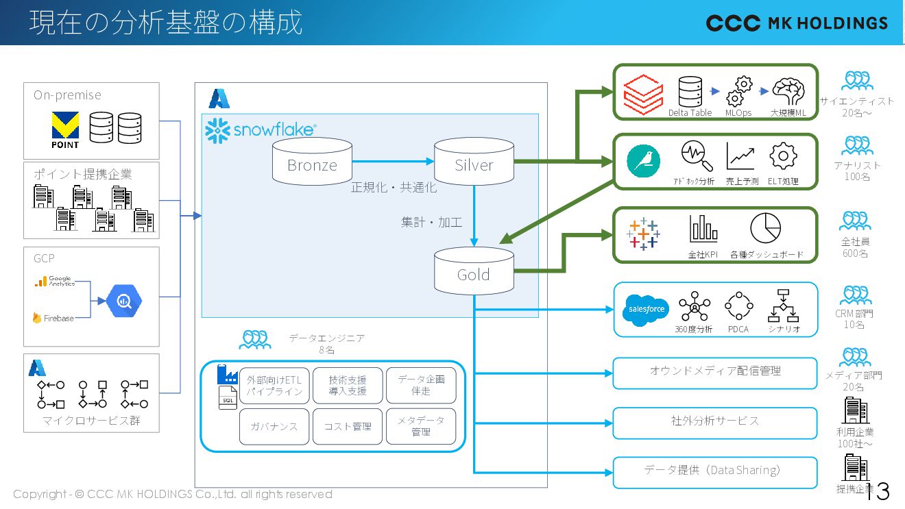 12 Snowflakeをなぜ選んだのか? アーキテクチャの先進性 ・コンピュート/ストレージ分離 ・マイクロパーティションによるI/Oボトルネックの最小化 ・サイロ化したDWH群を統合しても競合しないアーキテクチャ 移植性の高さとスケーラビリティ ・Oracle Exadata/Azure Synapse/Verticaからの統合(PoCしてSQLの互換性も全て評価) ・3DBを移植するための互換性や柔軟性の高さ ・統合後も性能・安定性・コストをクリアできる信頼感(各DB,サービス単位で段階的PoCにて実証) 柔軟なコスト/性能、運用負担の少なさ ・複雑な移行パスに対して、従量課金で全てコントロールできる ・ワークロードが競合せず、それぞれの部門が制約なく自由に分析できる ・インフラの保守が不要で、ベンダーに依存せず、データエンジニアが自分たちで保守運用できる Databricks 2020年時点ではDWH機能が弱く、移行候補になりえなかった ※その後、データサイエンス/AIの開発運用基盤として導入 BigQuery GCPへのプラットフォーム移行が必要で難易度から断念 ※その後、GA4などWeb分析のできるように事業部門側で導入 RedShift 3DBの統合先としては、アーキテクチャやコスト硬直性も懸念があった